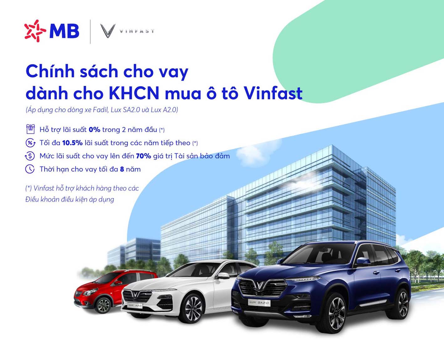 Theo đó, khi thực hiện thủ tục vay mua ô tô Vinfast, khách hàng của MB sẽ được Vinfast hỗ trợ lãi suất 0% trong 2 năm đầu, khách hàng chỉ cần thanh toán tiền gốc vay hàng tháng. Từ năm thứ 3 trở đi, khách hàng thanh toán tiền gốc và lãi vay với mức lãi suất không vượt quá 10,5%/năm; tỷ lệ cho vay lên đến 70% giá trị tài sản bảo đảm với thời gian vay tối đa lên đến 8 năm.