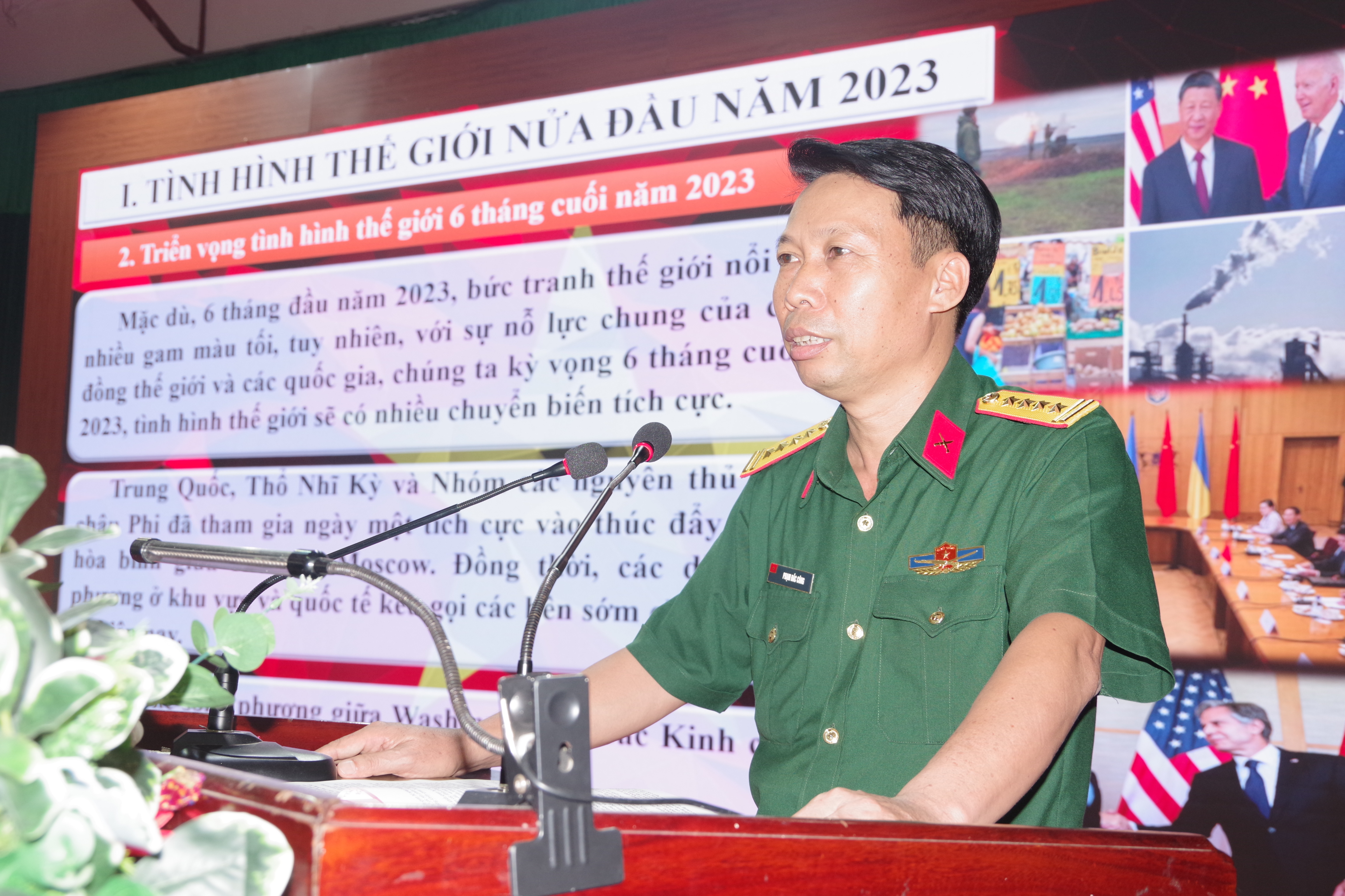 Lớp học nghe các đồng chí báo cáo viên trình bày các nội dung: Cuộc xung đột quân sự Nga - Ukraine và triển vọng giải quyết cuộc xung đột hiện nay theo góc nhìn của các bên. Campuchia tổ chức bầu cử Quốc hội khóa VII năm 2023. Nội dung tổng hợp tình hình thời sự chính trị nổi bật tháng 7-2023. Nội dung cơ bản của Luật Thi đua, khen thưởng năm 2022 và các văn bản quy định chi tiết, hướng dẫn thi hành.  Nội dung cơ bản của Luật Phòng, chống bạo lực gia đình năm 2022 và các văn bản quy định chi tiết, hướng dẫn thi hành.