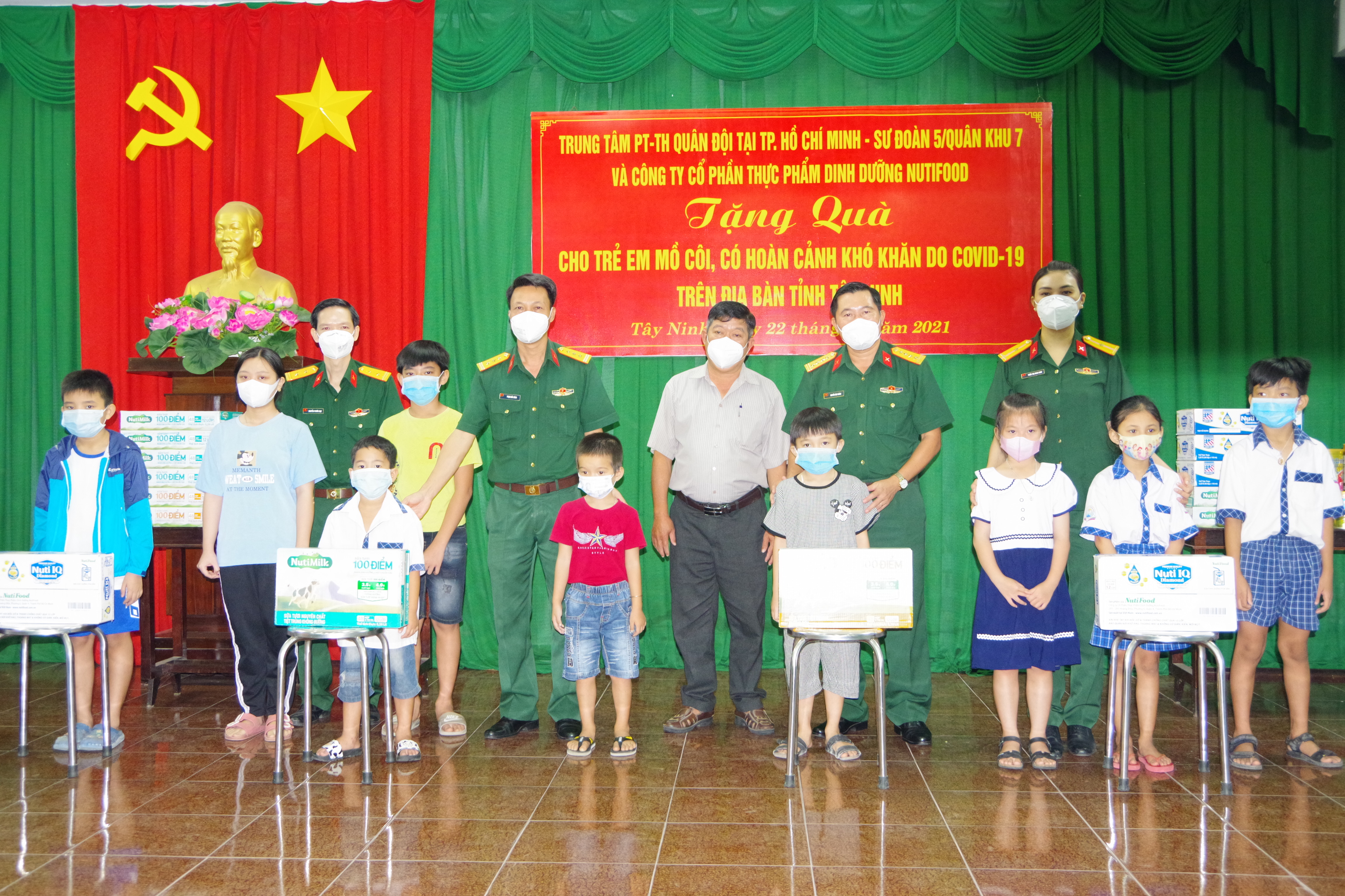 (QK7 Online) - Sáng 22/10, Sư đoàn 5 phối hợp Trung tâm Phát thanh - Truyền hình Quân đội và Công ty Cổ phần Thực phẩm dinh dưỡng NUTIFOOD trao 500 thùng sữa tặng các em nhỏ là con của cán bộ, nhân viên sư đoàn và trẻ em bị ảnh hưởng bởi dịch Covid-19 trên địa bàn tỉnh Tây Ninh.
