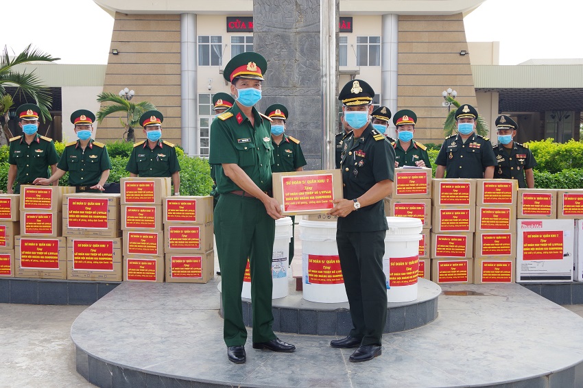 Thay mặt đoàn cán bộ Lữ đoàn Can thiệp số 1, Quân đội Hoàng Gia Campuchia Đại tá Long Na Rin, Phó Lữ đoàn trưởng, Lữ đoàn Can thiệp số 1 chân thành cảm ơn Đảng ủy, chỉ huy Sư đoàn 5, Quân khu 7 và chuyển thư cảm ơn của Đại tướng Prum Pheng, Phó Tư lệnh Lục quân, kiêm Lữ đoàn trưởng Lữ đoàn Can thiệp số 1, Quân đội Hoàng Gia Campuchia đến Thượng tá Lê Xuân Bình, Sư đoàn trưởng Sư đoàn 5 và các đồng chí trong chỉ huy Sư đoàn đã quan tâm hỗ trợ vật chất thiết bị y tế cho Lữ đoàn trong việc phòng chống dịch Covid-19.