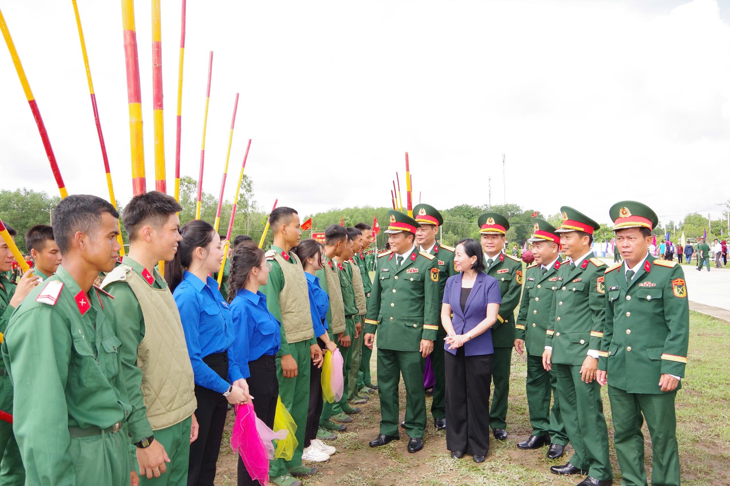 Đại tá Nguyễn Hữu Thắng, Chính ủy Sư đoàn 9 và Thủ trưởng cơ quan Quân đoàn 34 cùng lãnh đạo cấp ủy, chính quyền địa phương động viên chiến sĩ mới tại Trung đoàn 3.
