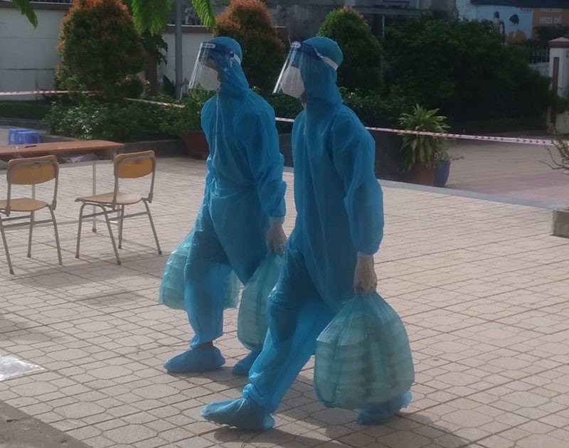 Hai chiến sĩ, đảng viên mới đi phát cơm tại Khu cách ly Trường Tiểu học Thạnh Phước, phường Thạnh Phước, TX Tân Uyên.