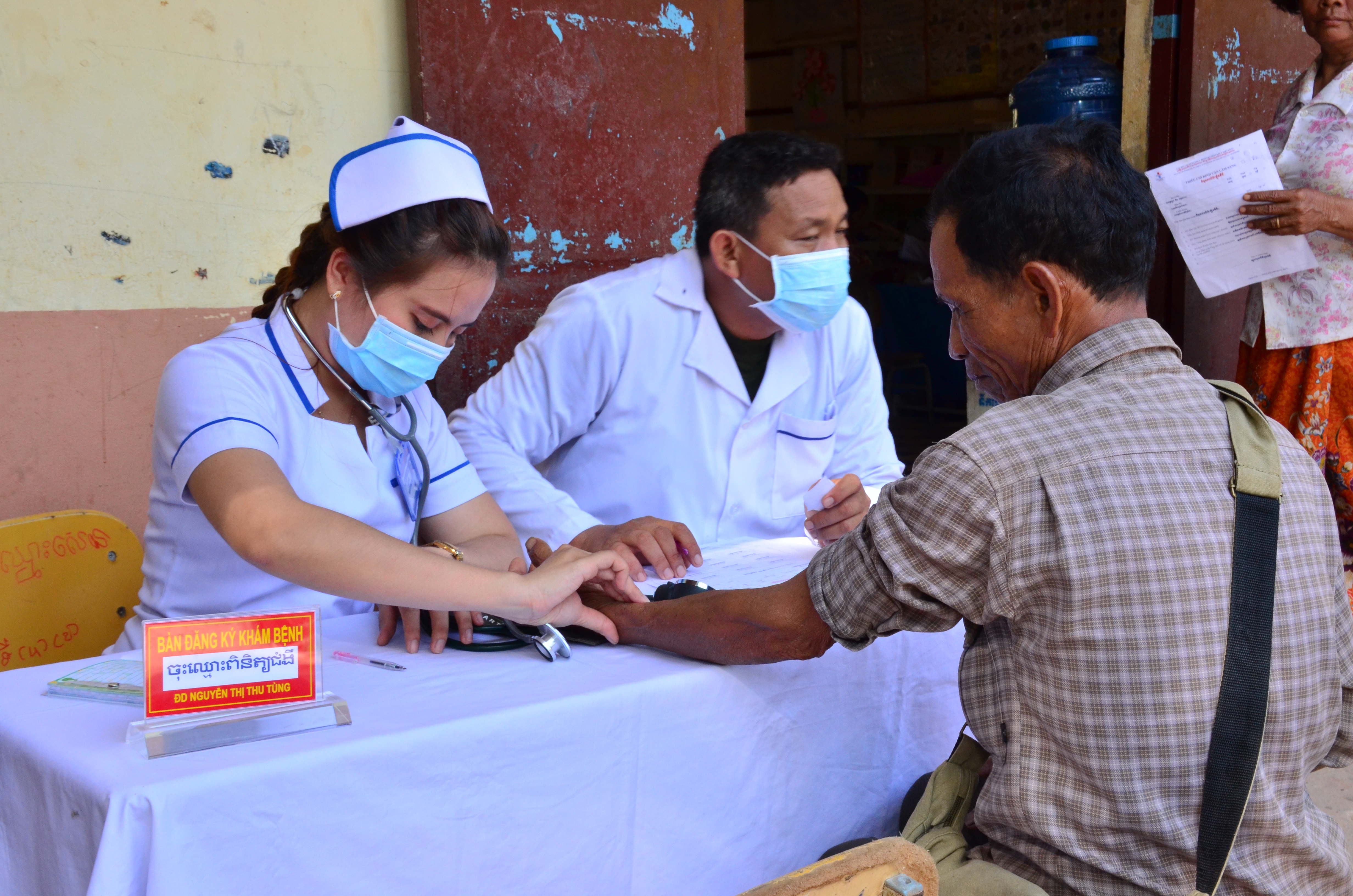 Các điều dưỡng thực hiện nhiệm vụ với sự giúp đỡ của các tình nguyện viên Quân y Quân khu 4, Quân đội Hoàng gia Campuchia.