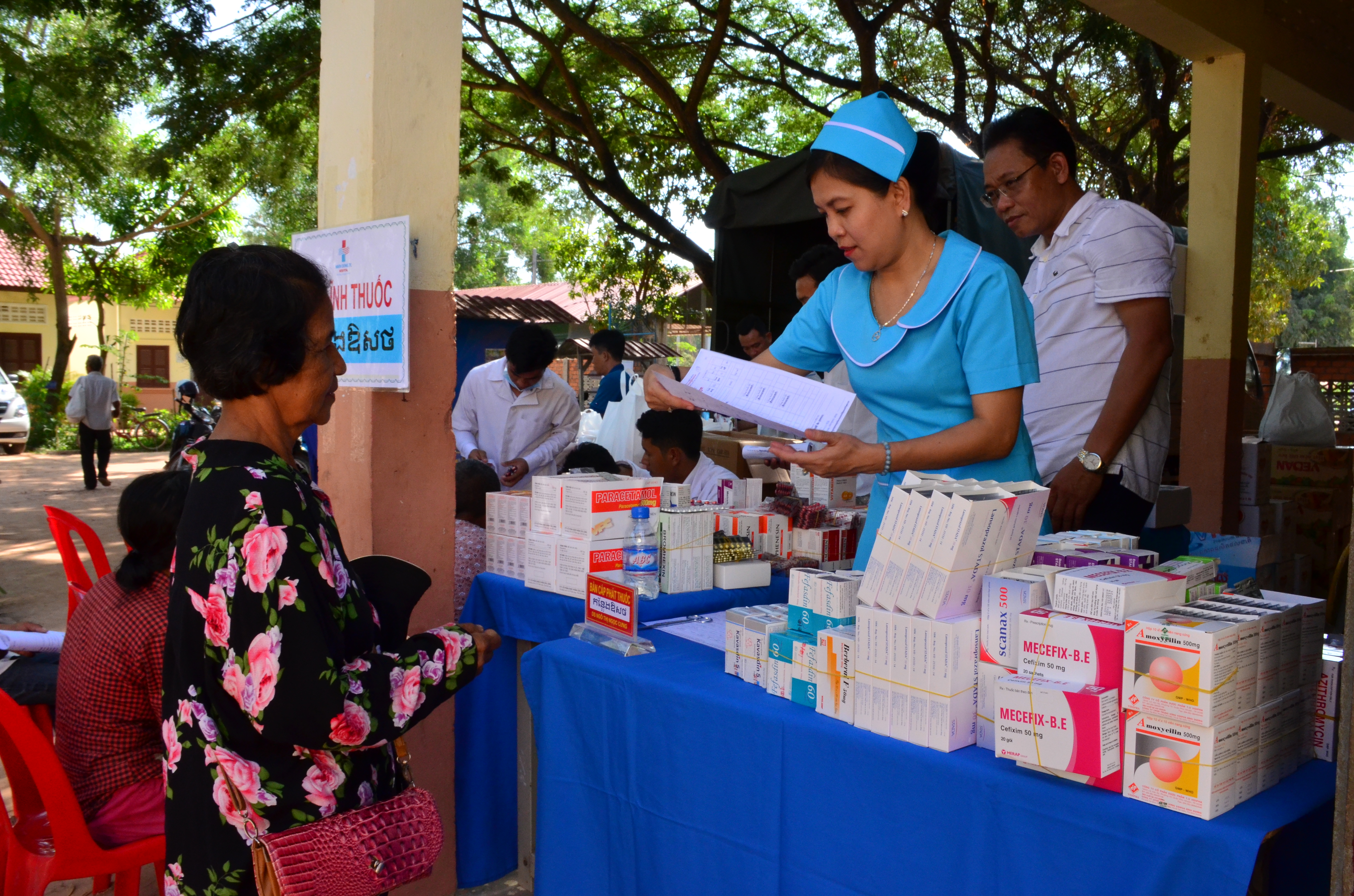 Từ sáng sớm, trong sân trường tiểu học Kod Chan người dân Campuchia đã tập trung kín sân trường để chờ đoàn y, bác sĩ của bệnh viện đến khám bệnh. Khi xe dừng bánh, mọi người ai cũng tất bật nhanh chóng đưa các trang thiết bị, thuốc và quà vào nơi tập kết để chuẩn bị cho buổi khám vào buổi sáng.