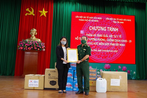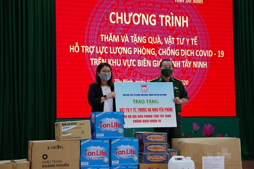 Đợt này, LHCTCHN thành phố Hồ Chí Minh tặng BĐBP tỉnh Tây Ninh 10.000 khẩu trang y tế và khẩu trang vải, 100 bộ đồ bảo hộ y tế, 200 lít dung dịch sát khuẩn, 100 thùng nước đóng chai, 50 thùng mì ăn liền và một số nhu yếu phẩm dùng cho sinh hoạt hàng ngày.