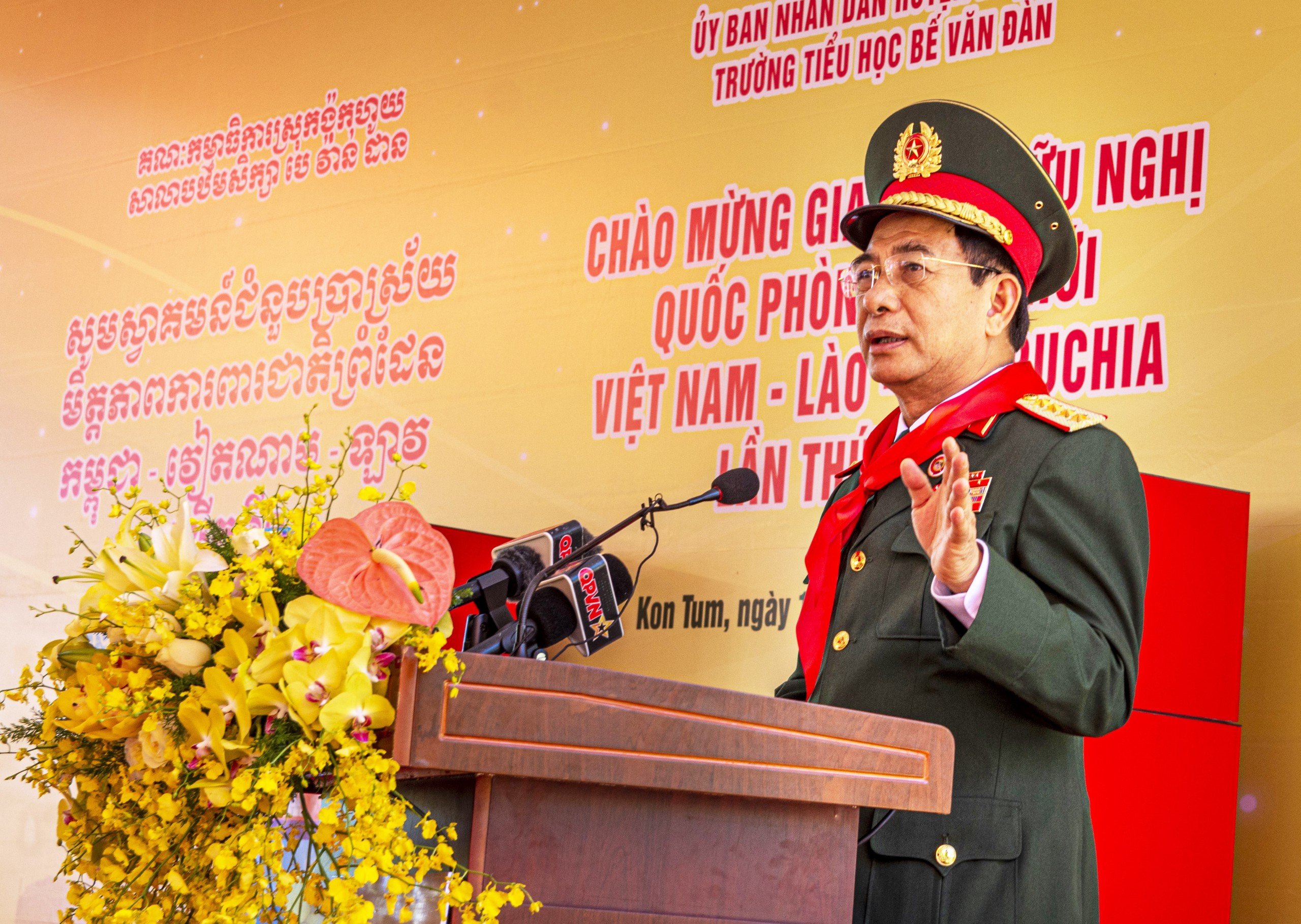 Thay mặt đoàn đại biểu ba nước, Đại tướng Phan Văn Giang, Ủy viên Bộ Chính trị, Phó Bí thư Quân ủy Trung ương, Bộ trưởng Bộ Quốc phòng Việt Nam bày tỏ xúc động khi đón nhận những bông hoa tươi thắm và chiếc khăn quàng đỏ trong tiếng trống rộn ràng của Đội Thiếu niên tiền phong Hồ Chí Minh. Đại tướng Phan Văn Giang cũng vui mừng khi được biết lãnh đạo địa phương và Ban giám hiệu nhà trường rất quan tâm, chú trọng đến việc tuyên truyền, giáo dục cho các cháu học sinh về truyền thống hữu nghị, đoàn kết giữa ba nước Campuchia, Lào, Việt Nam; nhiều năm qua đã tổ chức các hoạt động chào cờ tại cột mốc biên giới ngã ba Đông Dương, thăm hỏi, tặng quà lực lượng bảo vệ biên giới. Mong rằng các cháu học sinh sẽ luôn cố gắng học tập và rèn luyện, góp phần xây dựng đất nước và trở thành cầu nối cho quan hệ hữu nghị, đoàn kết đặc biệt ba nước Campuchia, Lào, Việt Nam.