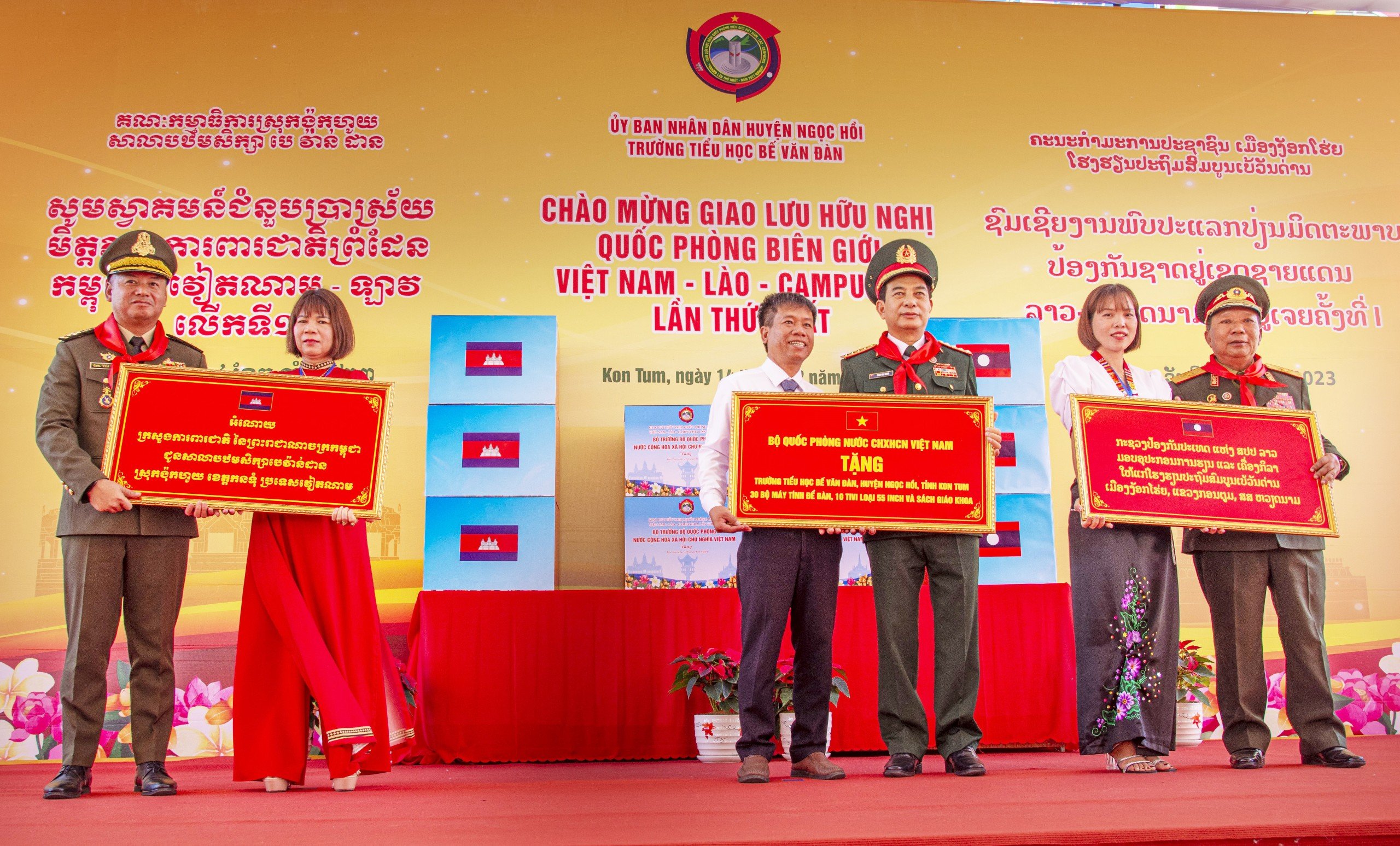 Bộ trưởng Bộ Quốc phòng ba nước Việt Nam - Lào - Campuchia tặng quà Trường Tiểu học Bế Văn Đàn.