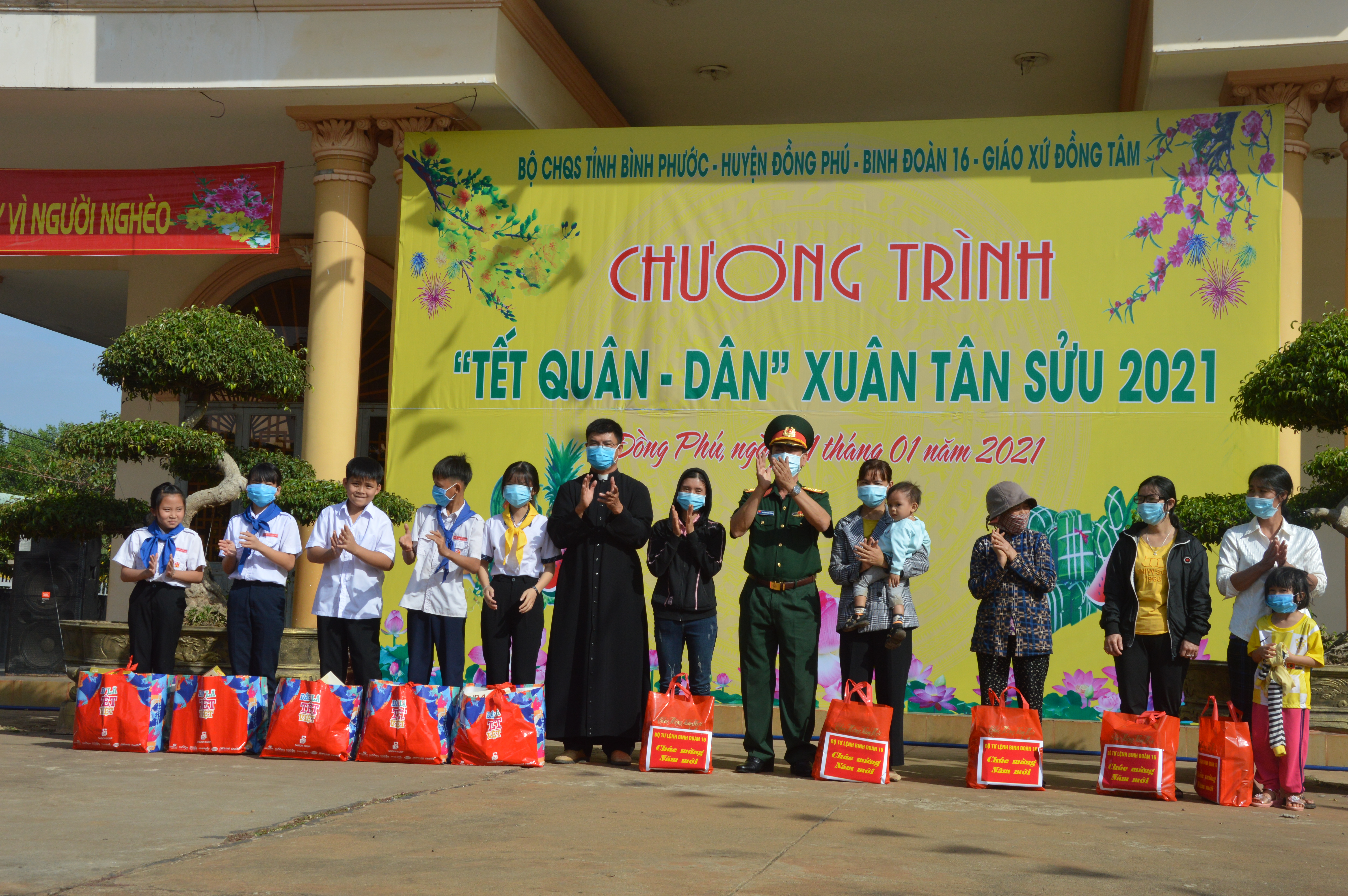 (QK7 Online) - Tại giáo xứ Đồng Tâm, xã Đồng Tiến, huyện Đồng Phú, Bộ CHQS tỉnh Bình Phước phối hợp UBND huyện Đồng Phú, Bộ Tư lệnh Binh đoàn 16, Giáo xứ Đồng Tâm tổ chức chương trình “Tết quân dân” Xuân Tân Sửu 2021.