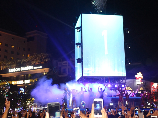 Dù không có màn pháo hoa hoành tráng nhưng sân khấu Countdown ở phố đi bộ Nguyễn Huệ cũng làm hàng ngàn bạn trẻ, du khách nước ngoài nhún nhảy vui chơi và cùng đếm những giây cuối cùng của năm 2017.