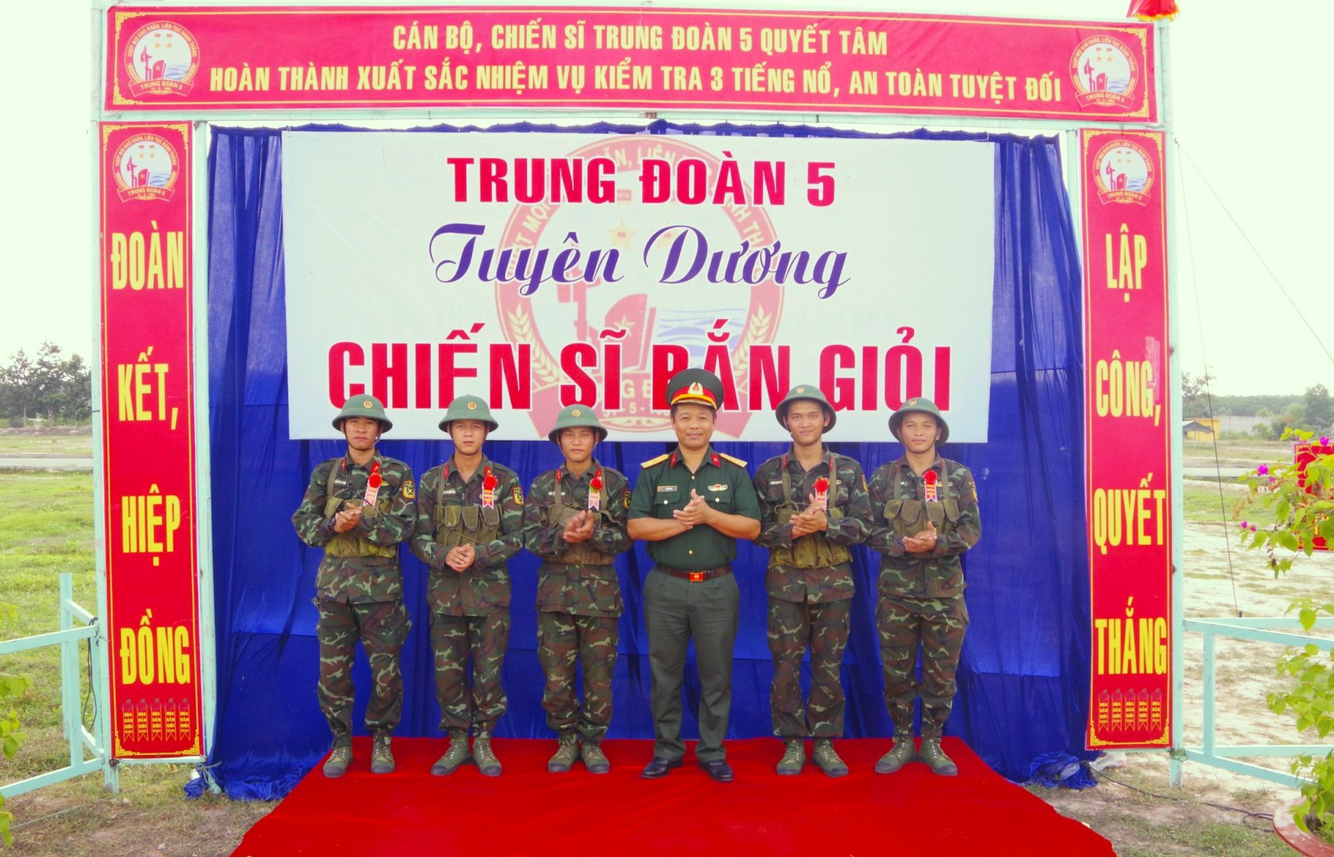 Trung tá Lê Quốc Huy, Chính ủy Trung đoàn 5, tặng hoa bắn giỏi cho chiến sĩ mới.