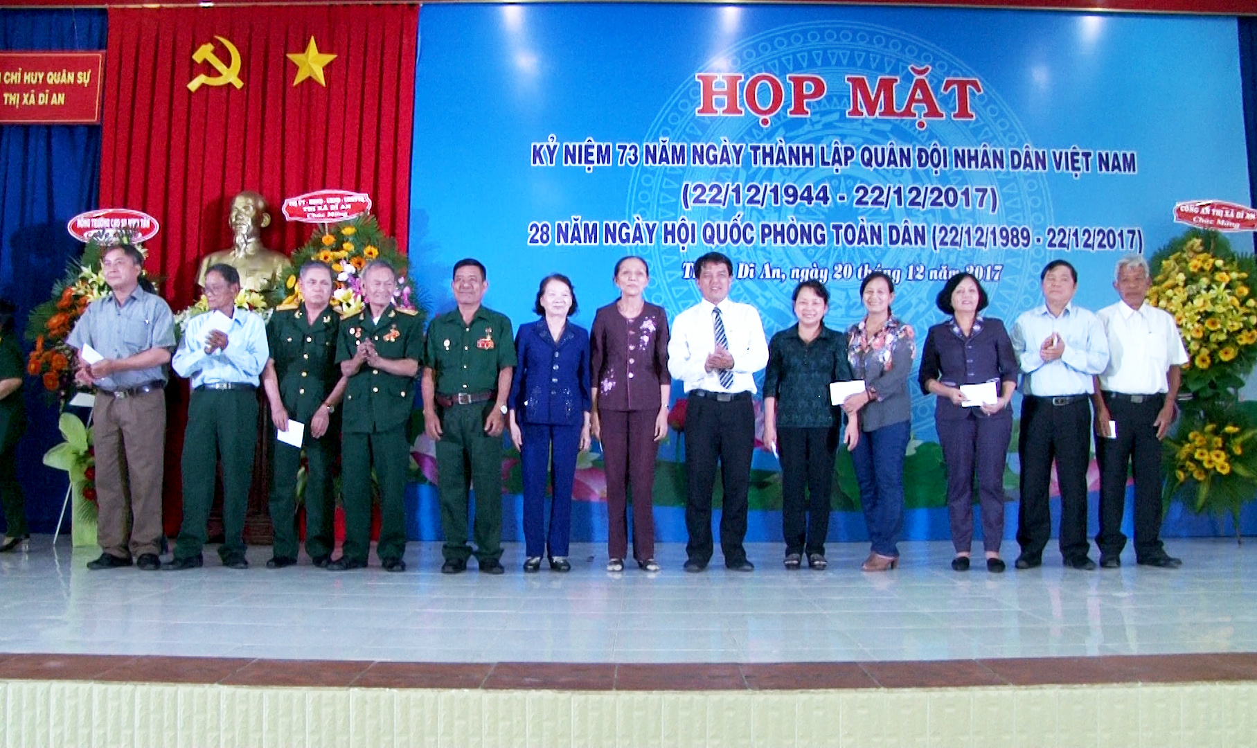 (QK7 Online) - Ngày 21 tháng 12 năm 2017, Ban chỉ huy quân sự thị xã Dĩ An, tỉnh Bình Dương tổ chức họp mặt kỷ niệm 73 năm ngày thành lập Quân đội nhân dân Việt Nam 22/12/1944-22/12/2017 và 28 năm ngày hội quốc phòng toàn dân 22/12/1989-22/12/2017. Tham dự lễ kỷ niệm có các Anh hùng lực lượng vũ trang nhân dân, các thế hệ cán bộ chiến sĩ  Quân đội trung cao cấp đang sinh sống trên địa bàn thị xã.