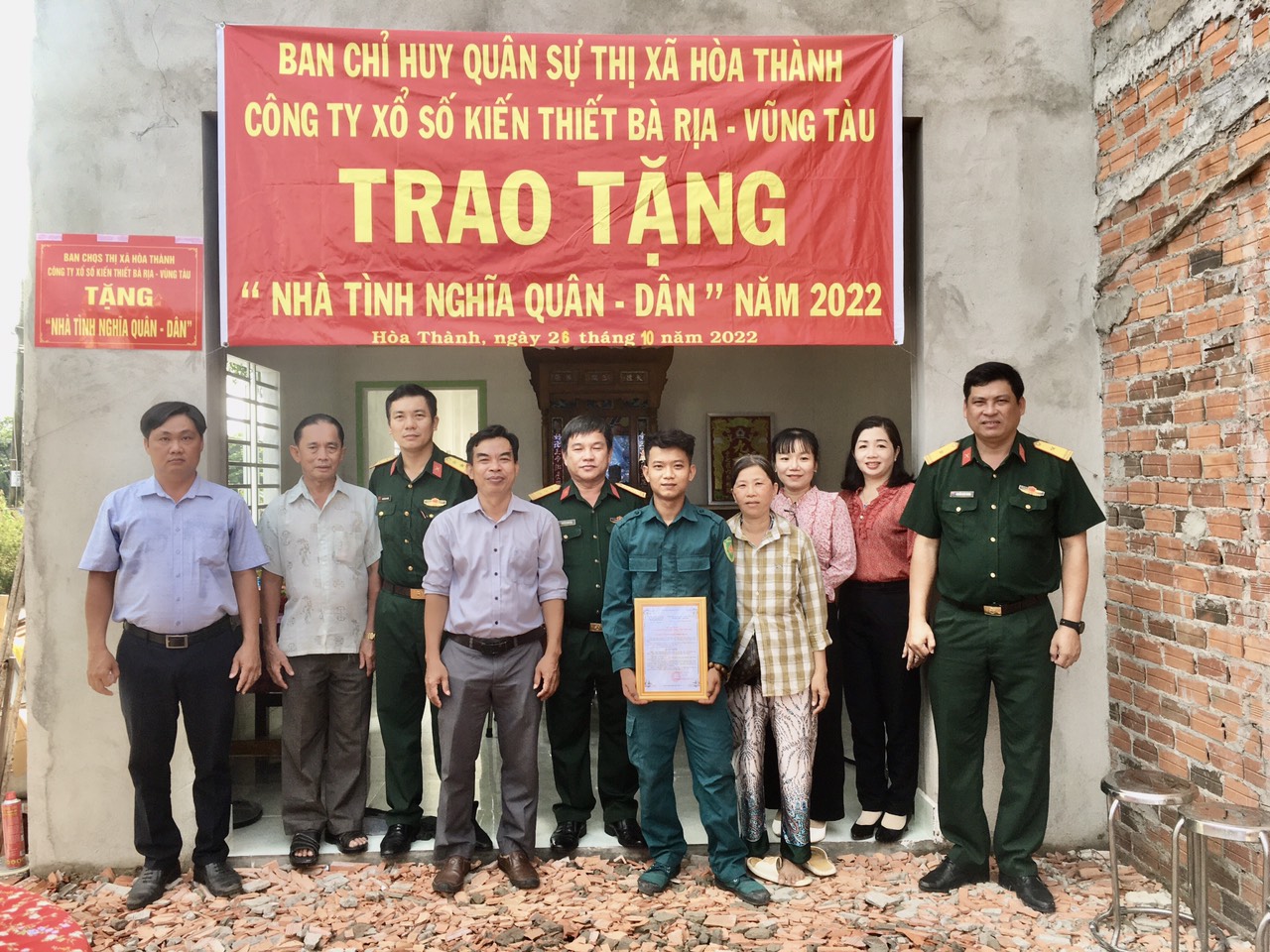 Từ đầu năm đến nay, Ban CHQS thị xã Hòa Thành phối hợp với chính quyền địa phương và các nhà hảo tâm trao tặng 7 căn nhà “Tình nghĩa quân - dân” cho chiến sĩ dân quân thường trực, hộ nghèo là tín đồ tôn giáo Cao Đài, trị giá trên 800 triệu đồng.