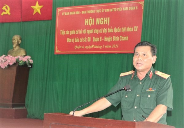 Thiếu tướng Đặng Văn Lẫm phát biểu tại hội nghị tiếp xúc cử tri tại Quận 6, TPHCM.