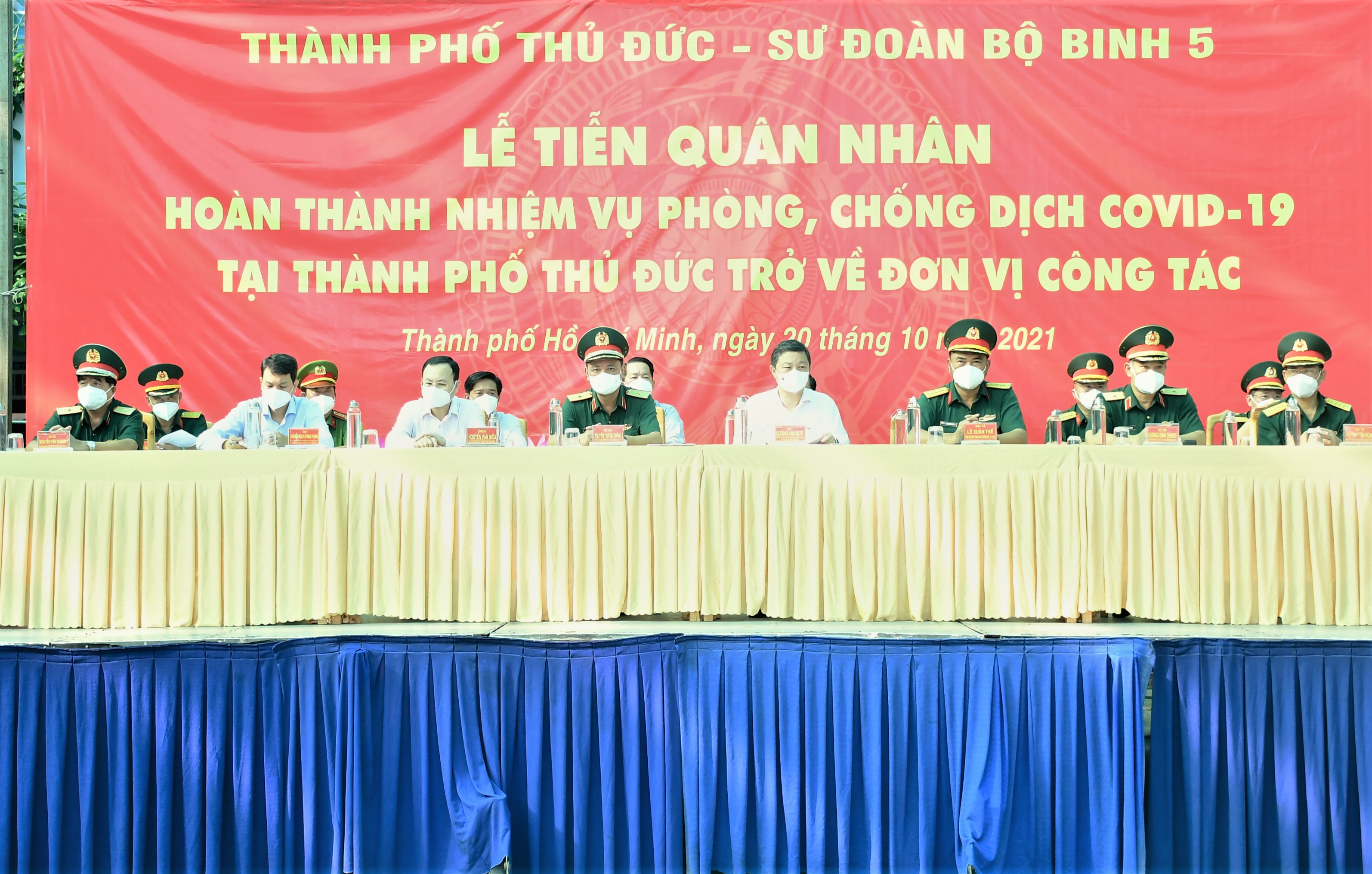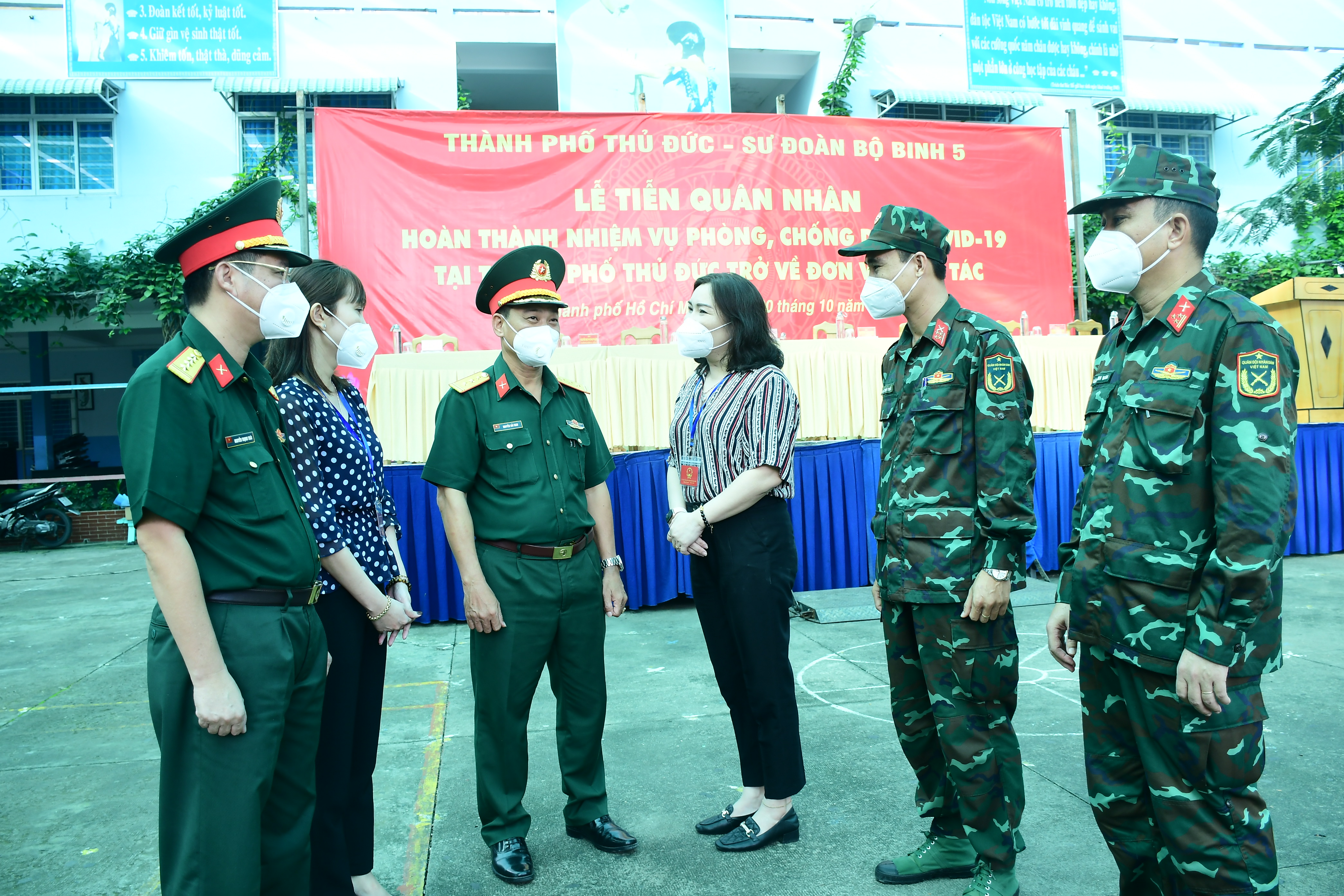 Chấp hành chỉ đạo của Bộ Tư lệnh Quân khu, từ ngày 23/8 đến nay, 835 cán bộ, chiến sĩ Sư đoàn 5 hành quân đến thành phố Thủ Đức, phối hợp cùng 787 đồng chí tăng cường thuộc Trường Sĩ quan Lục quân 2, Trường Cao đẳng Hải quân, Trường Cao đẳng Hậu cần 2, Học viện Quân y, Trung đoàn Gia Định và Tiểu đoàn Kiểm soát Quân sự 31 (Bộ Tư lệnh TP.HCM) hỗ trợ thành phố Thủ Đức phòng, chống dịch Covid-19.