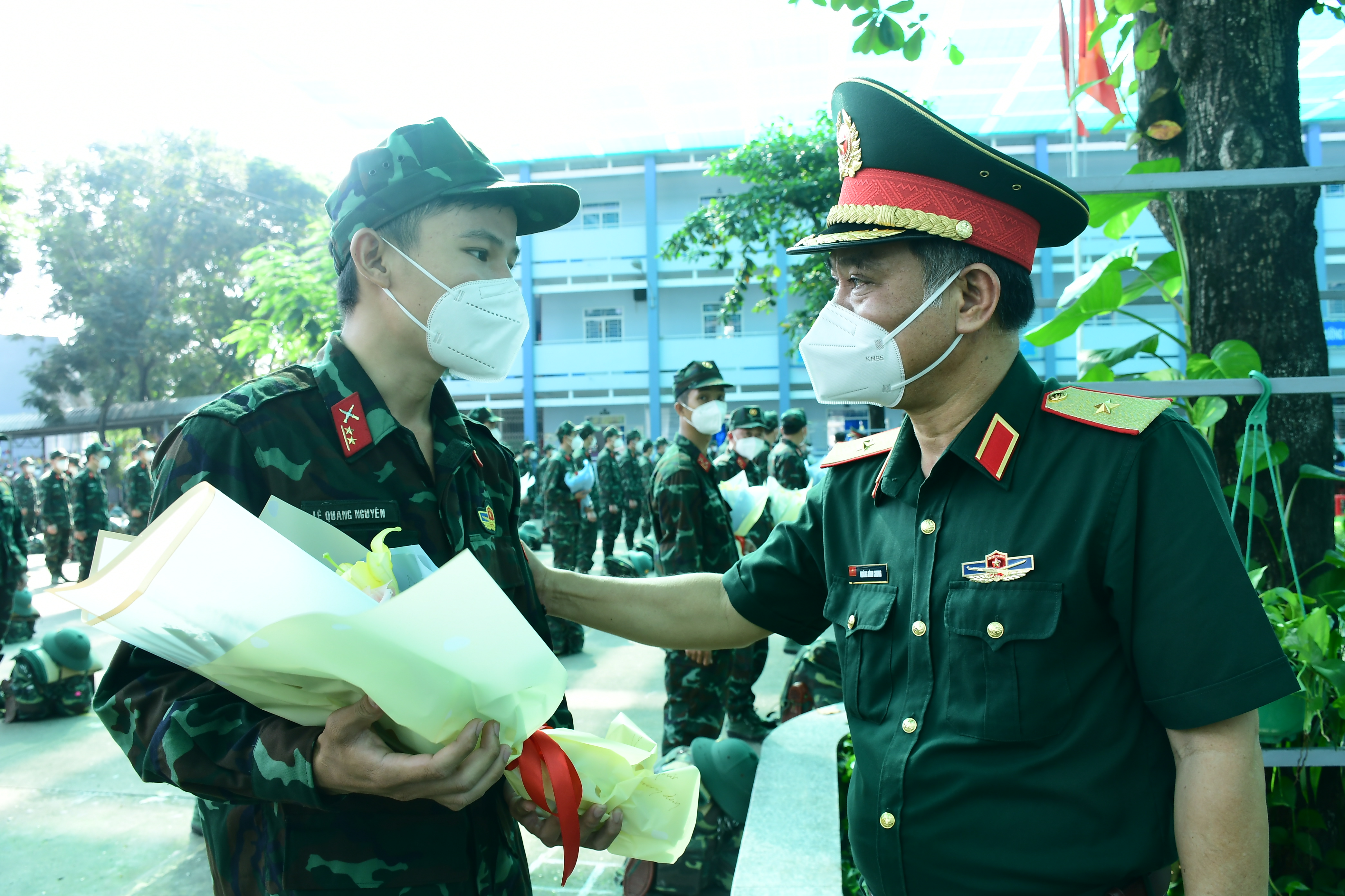 Thiếu tướng Nguyễn Trường Thắng, Ủy viên Trung ương Đảng, Tư lệnh Quân khu 7 tặng hoa động viên chiến sĩ Sư đoàn 5 hoàn thành nhiệm vụ giúp dân chống dịch.