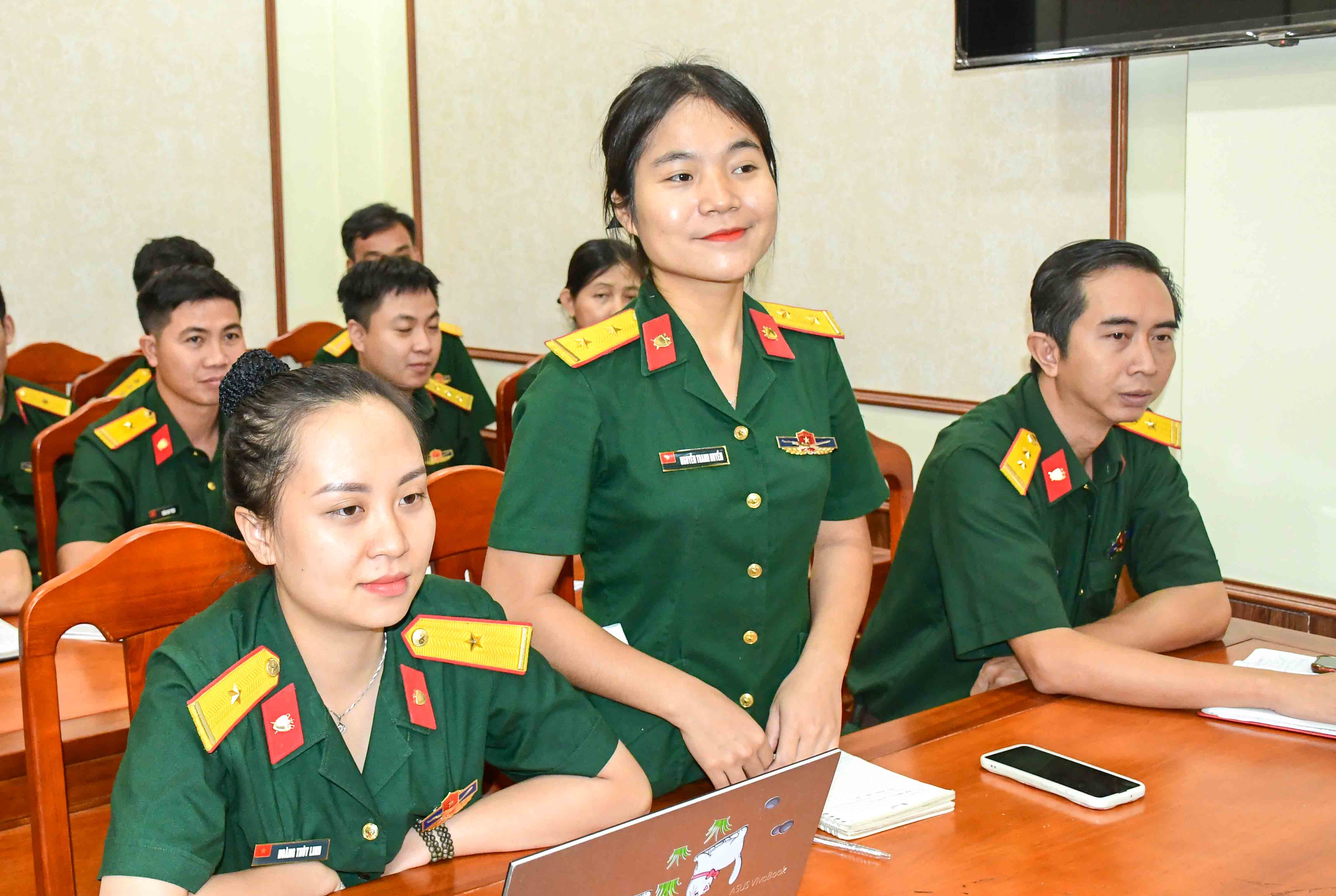 Trung tá Trần Hải Phong, Cán bộ Tòa án Quân sự Quân khu phát biểu. Trung úy Nguyễn Thanh Huyền, phát biểu tại buổi đối thoại.