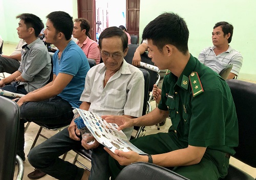 Cán bộ Biên phòng tỉnh Bình Thuận tuyên truyền cho ngư dân về các loài thủy sản quý hiếm, nguy cấp cần được bảo vệ.