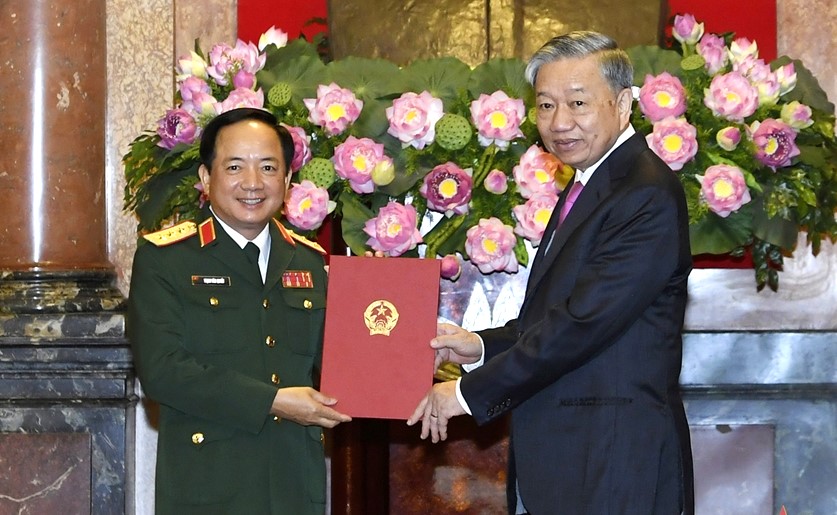 Chủ tịch nước Tô Lâm trao Quyết định bổ nhiệm chức vụ Chủ nhiệm Tổng cục Chính trị Quân đội nhân dân Việt Nam cho Thượng tướng Trịnh Văn Quyết. Ảnh: TUẤN HUY