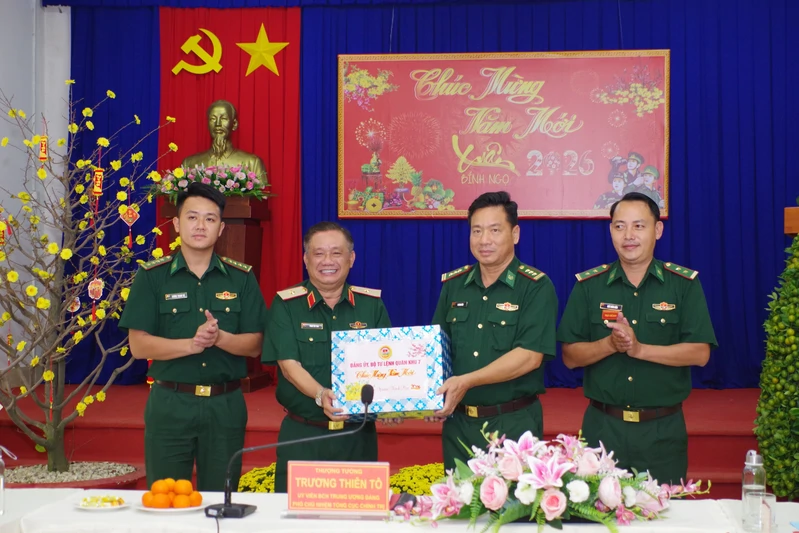 QK7 Online) - Sáng 29/1, Đoàn công tác Tổng cục Chính trị do Thượng tướng Trương Thiên Tô, Ủy viên Ban chấp hành Trung ương Đảng, Phó Chủ nhiệm Tổng cục Chính trị Quân đội nhân dân Việt Nam làm trưởng đoàn đã đến kiểm tra, thăm và tặng quà dịp Tết Nguyên đán Bính Ngọ 2026 tại Đồn Biên phòng Cửa khẩu quốc tế Mộc Bài và Sư đoàn 5.