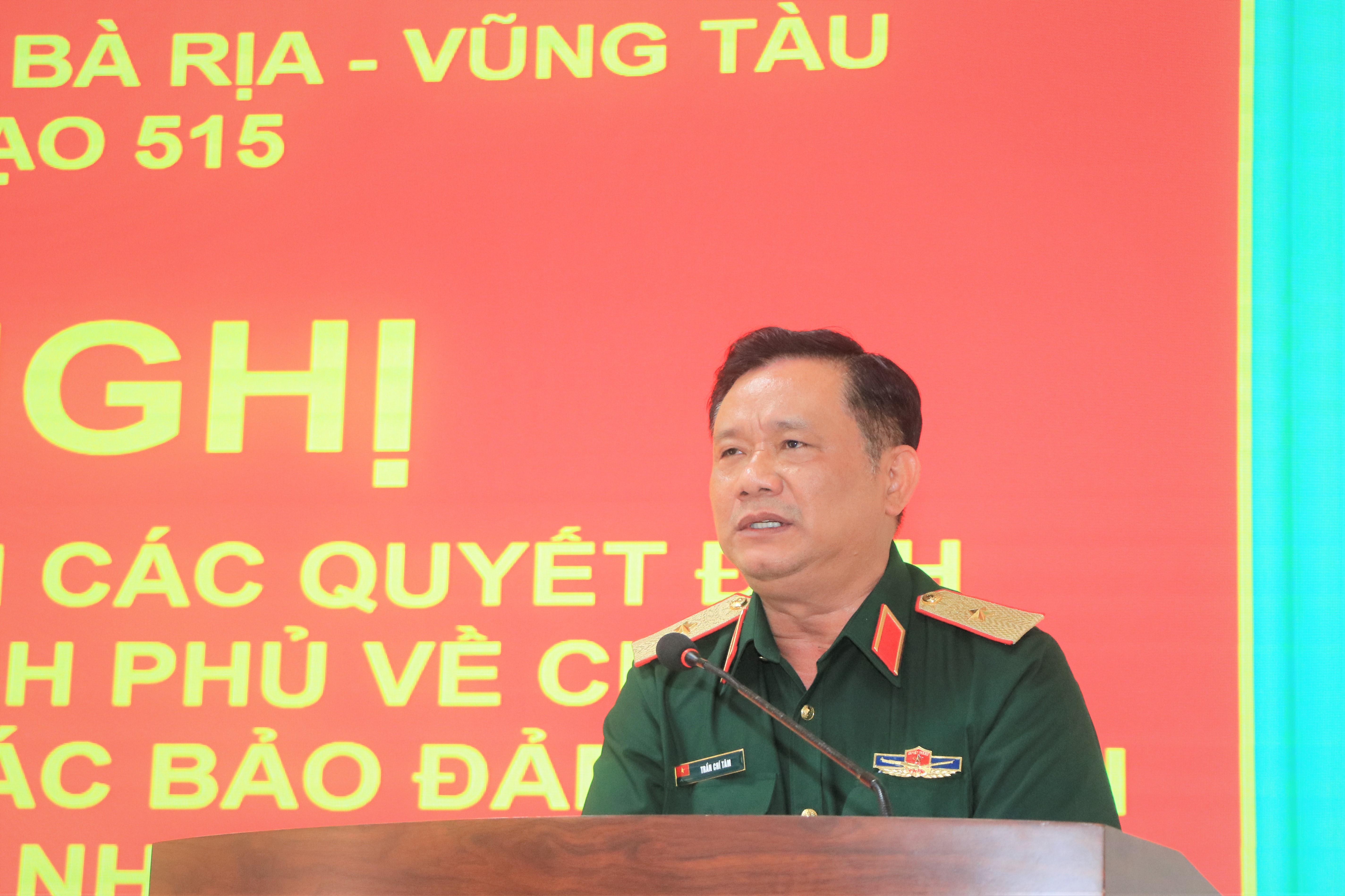 (QK7 Online) - Ngày 29-3, tại Bộ CHQS tỉnh Bà Rịa - Vũng Tàu, Ban Chỉ đạo 515 tỉnh tổ chức hội nghị tổng kết thực hiện Quyết định số 75 và Quyết định số 35 của Thủ tướng Chính phủ về chế độ, chính sách và công tác bảo đảm đối với tổ chức, cá nhân làm nhiệm vụ tìm kiếm, quy tập hài cốt liệt sĩ. Thiếu tướng Trần Chí Tâm, Phó Chủ nhiệm Chính trị Quân khu dự, chỉ đạo hội nghị.