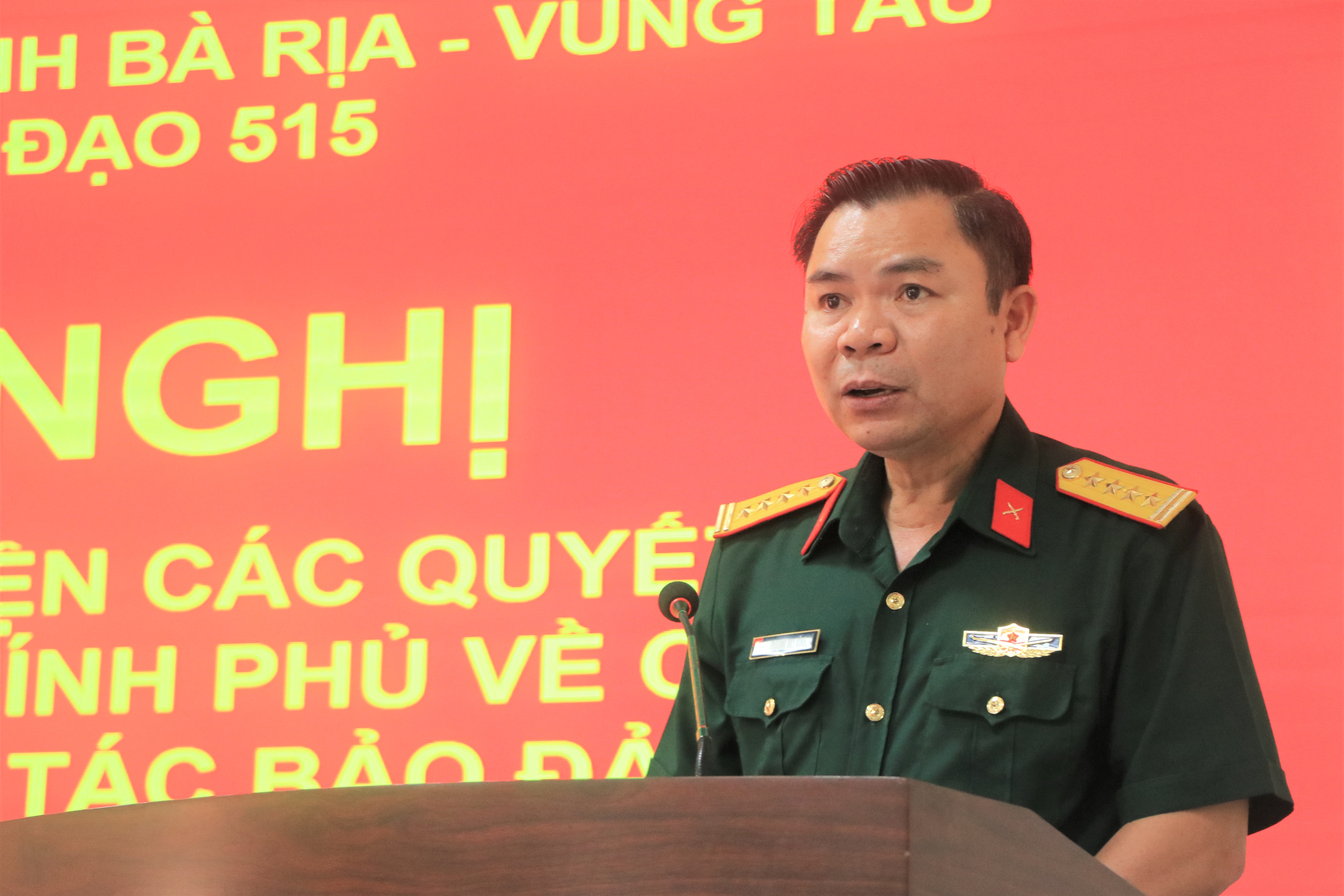 Đại tá Trương Huy Bình, Chủ nhiệm Chính trị Bộ CHQS tỉnh Bà Rịa - Vũng Tàu, thành viên Ban Chỉ đạo 515 tỉnh báo cáo kết quả triển khai thực hiện Quyết định số 75 và số 35 của Thủ tướng Chính phủ.