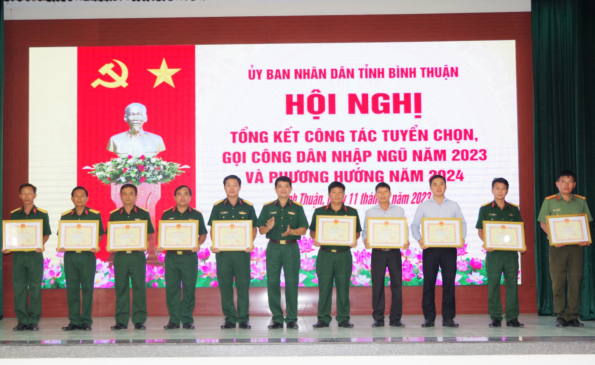 Phát biểu kết luận hội nghị, Đại tá Nguyễn Anh Nghĩa nhấn mạnh: với sự vào cuộc của cả hệ thống chính trị, tỉnh Bình Thuận đã làm tốt công tác tuyển chọn và gọi công dân nhập ngũ năm 2023, hoàn thành 100% chỉ tiêu giao quân ở cả 3 cấp (tỉnh, huyện, xã). Để thực hiện nhiệm vụ tuyển chọn và gọi công dân nhập ngũ năm 2024, đồng chí yêu cầu UBND các huyện, thị xã, thành phố và Hội đồng nghĩa vụ Quân sự các cấp rút kinh nghiệm những hạn chế để kịp thời lãnh đạo, chỉ đạo xây dựng kế hoạch triển khai chặt chẽ, đúng quy trình, quy định về công tác tuyển quân năm 2024; đẩy mạnh công tác tuyên truyền các quy định của pháp luật, nhất là Luật nghĩa vụ quân sự, chính sách hậu phương Quân đội, các tiêu chuẩn trong tuyển quân… Các địa phương nắm chắc thực lực tại địa bàn cơ sở, tham mưu cho cấp ủy, chính quyền, Hội đồng nghĩa vụ quân sự tỉnh hoàn thành chỉ tiêu giao quân theo quy định; tổ chức thực hiện tốt công tác đăng ký, quản lý nguồn công dân trong độ tuổi sẵn sàng nhập ngũ; làm tốt công tác xét duyệt các tiêu chuẩn, sơ tuyển, khám sức khỏe, bình cử công khai chặt chẽ không để sai sót, đảm bảo đúng quy định của pháp luật; kịp thời xử lý những công dân chống lệnh gọi nhập ngũ. Bộ Chỉ huy Quân sự tỉnh phối hợp chặt chẽ với Công an tỉnh hướng dẫn về đối tượng, độ tuổi, trình độ, sức khỏe theo chỉ tiêu tuyển chọn Công an nhân dân để các địa phương thực hiện thống nhất.