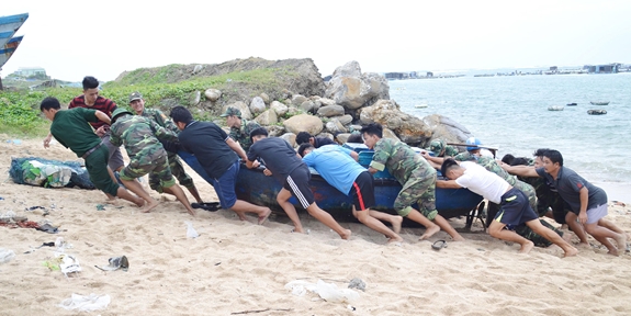 Cán bộ, chiến sĩ LLVT huyện Phú Quý, tỉnh Bình Thuận giúp ngư dân kéo tàu, thuyền lên bờ tránh bão. Ảnh Báo QĐND