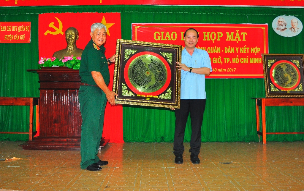 Trung tướng Phan Văn Việt, Bí thư Đảng ủy, Chính ủy Tổng cục II tặng quà lưu niệm UBND huyện Cần Giờ.
