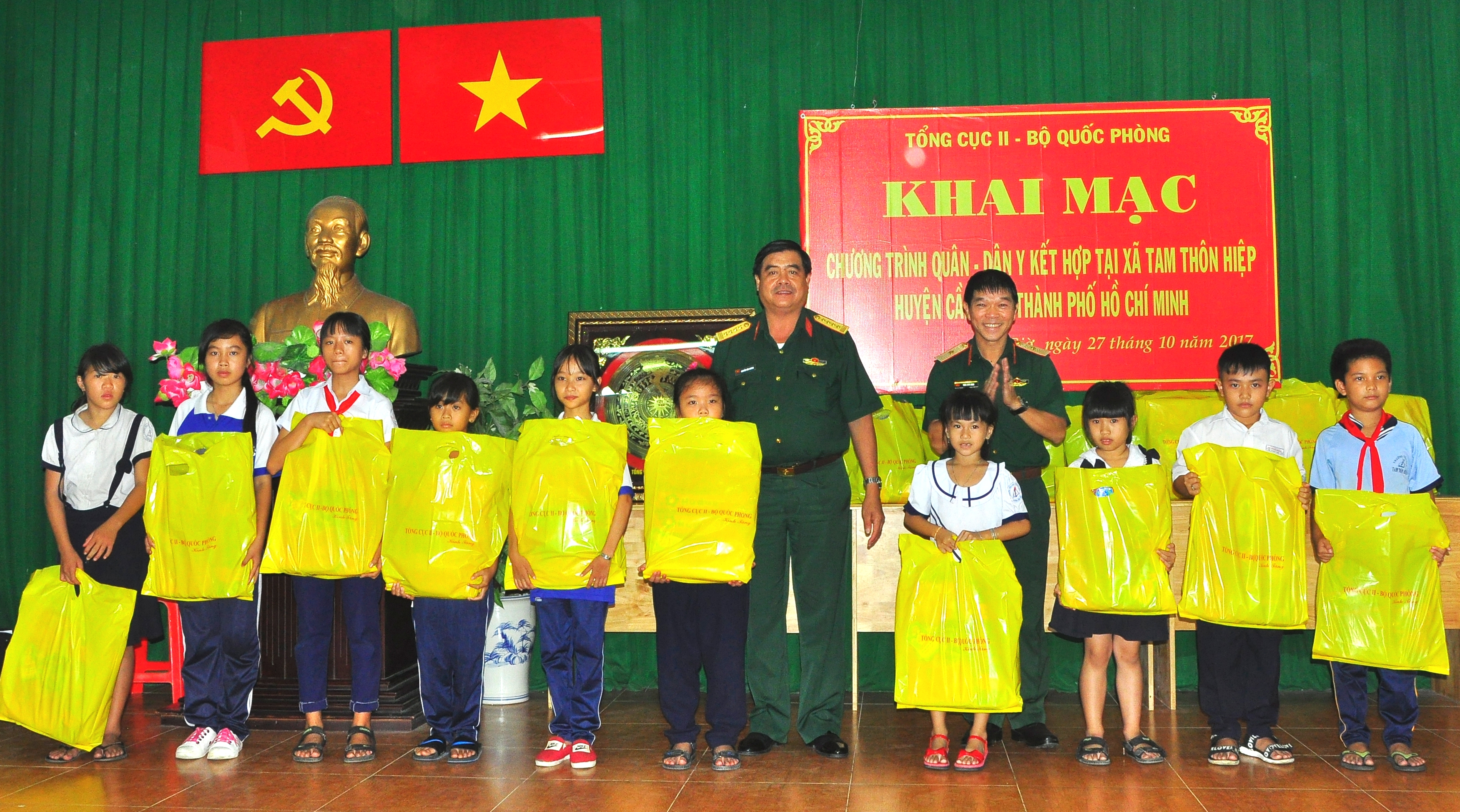 Thiếu tướng Trần Quốc Minh, Chủ nhiệm Chính trị Tổng cục II và Đại tá Nguyễn Văn Hoàng, Phó Tư lệnh, Tham mưu trưởng Bộ Tư lệnh TPHCM tặng quà học sinh nghèo của xã Tam Thôn Hiệp, Cần Giờ