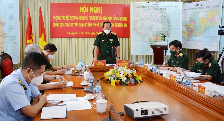 Thượng tướng Võ Minh Lương, Ủy viên Trung ương Đảng, Thứ trưởng Bộ Quốc phòng, Tổ trưởng Tổ công tác đặc biệt của Chính phủ về PCD Covid-19 tại các tỉnh phía Nam chủ trì hội nghị.