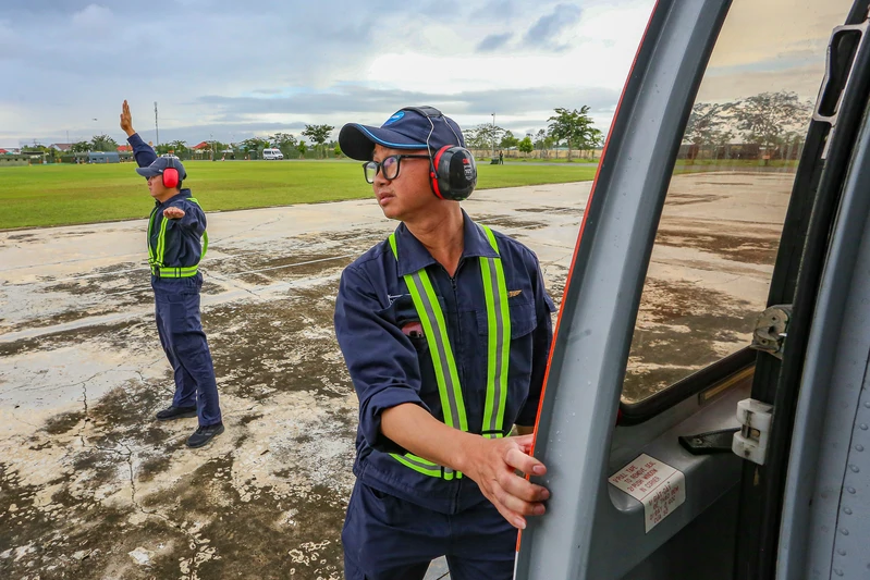 Bộ đội Không quân hướng dẫn vận chuyển người bị thương lên trực thăng.