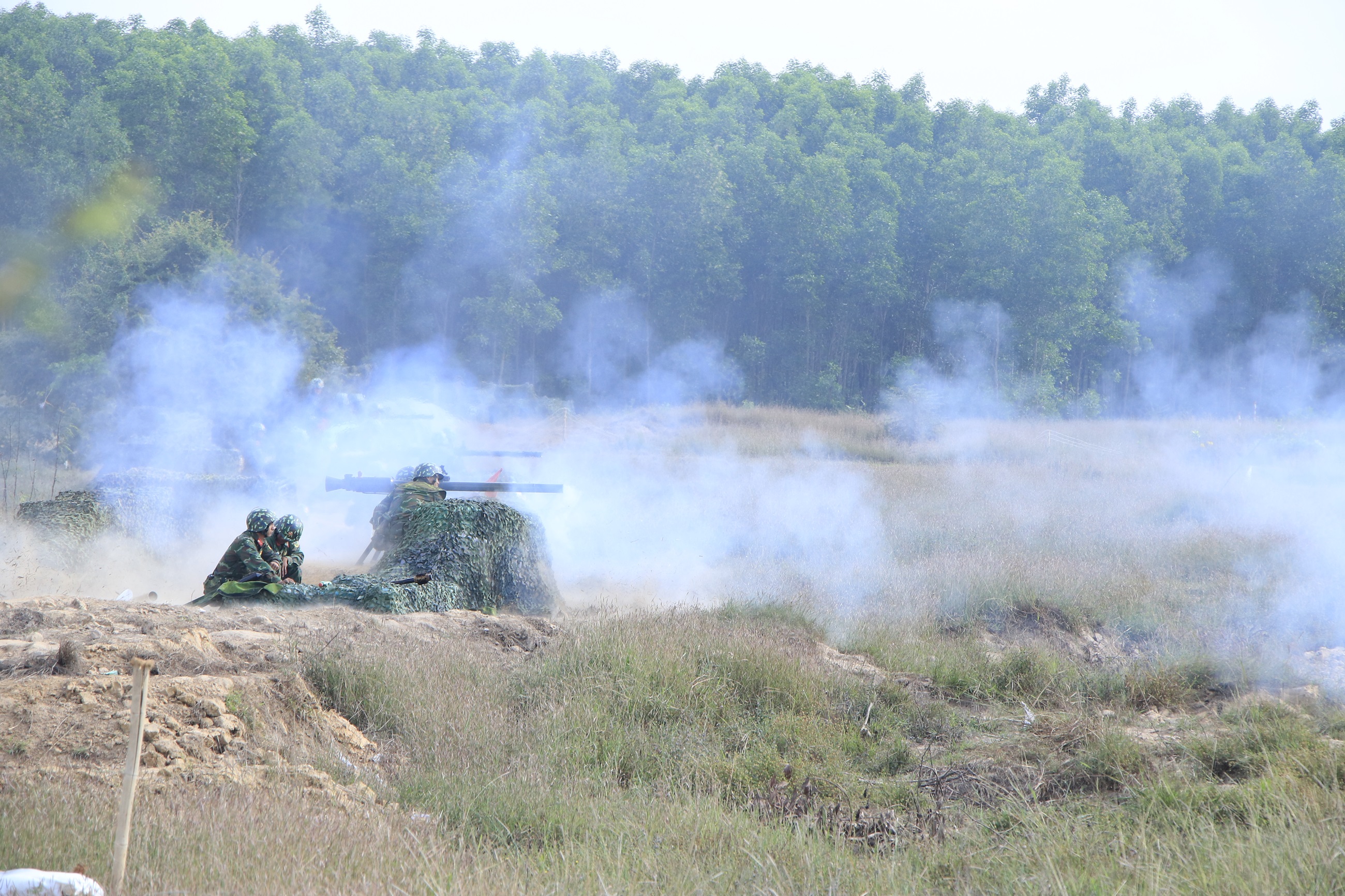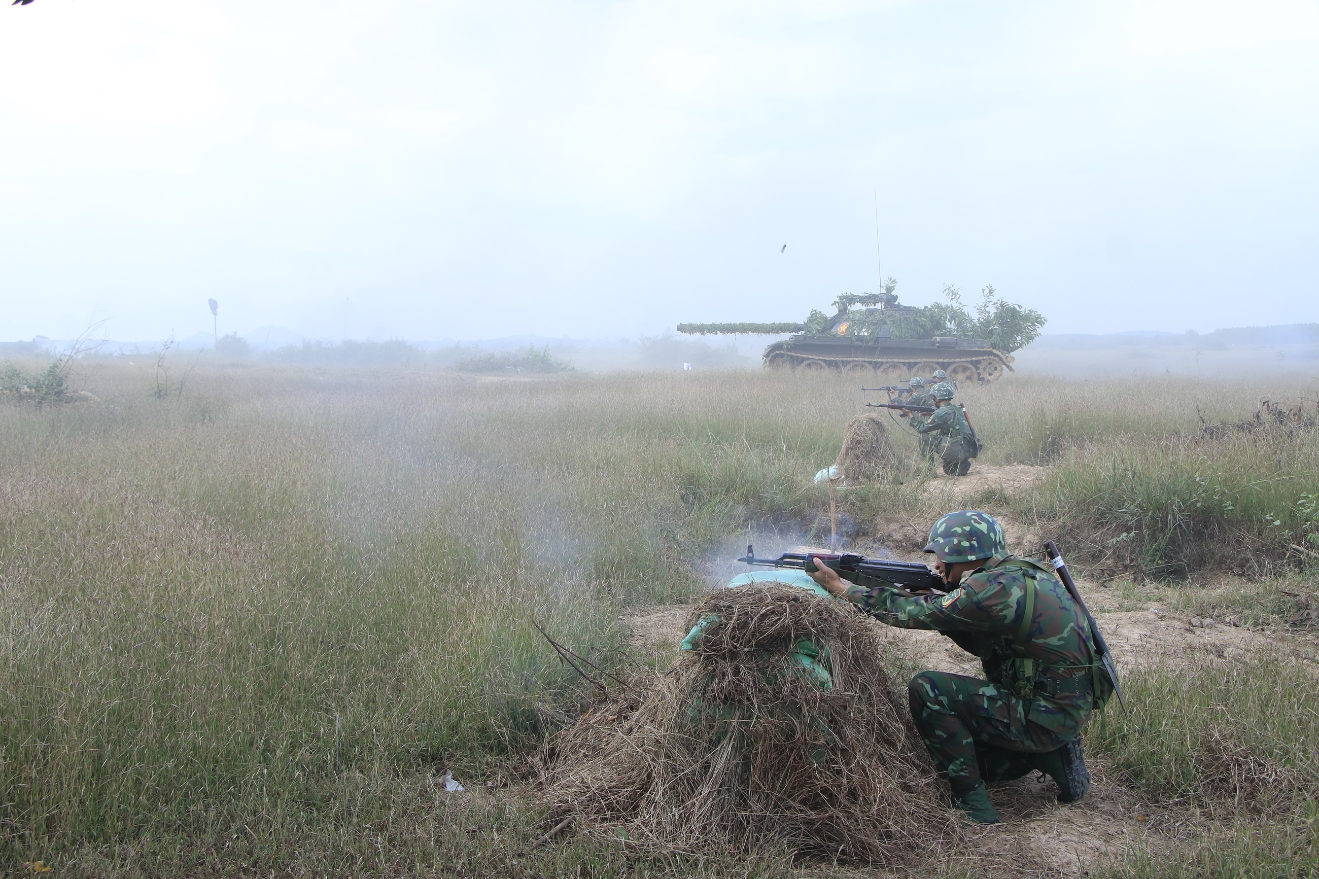 Bộ binh của Trung đoàn 271 phối hợp cùng xe tăng tiến công địch đổ bộ đường không trong diễn tập chiến thuật bắn đạn thật cấp Tiểu đoàn năm 2023.
