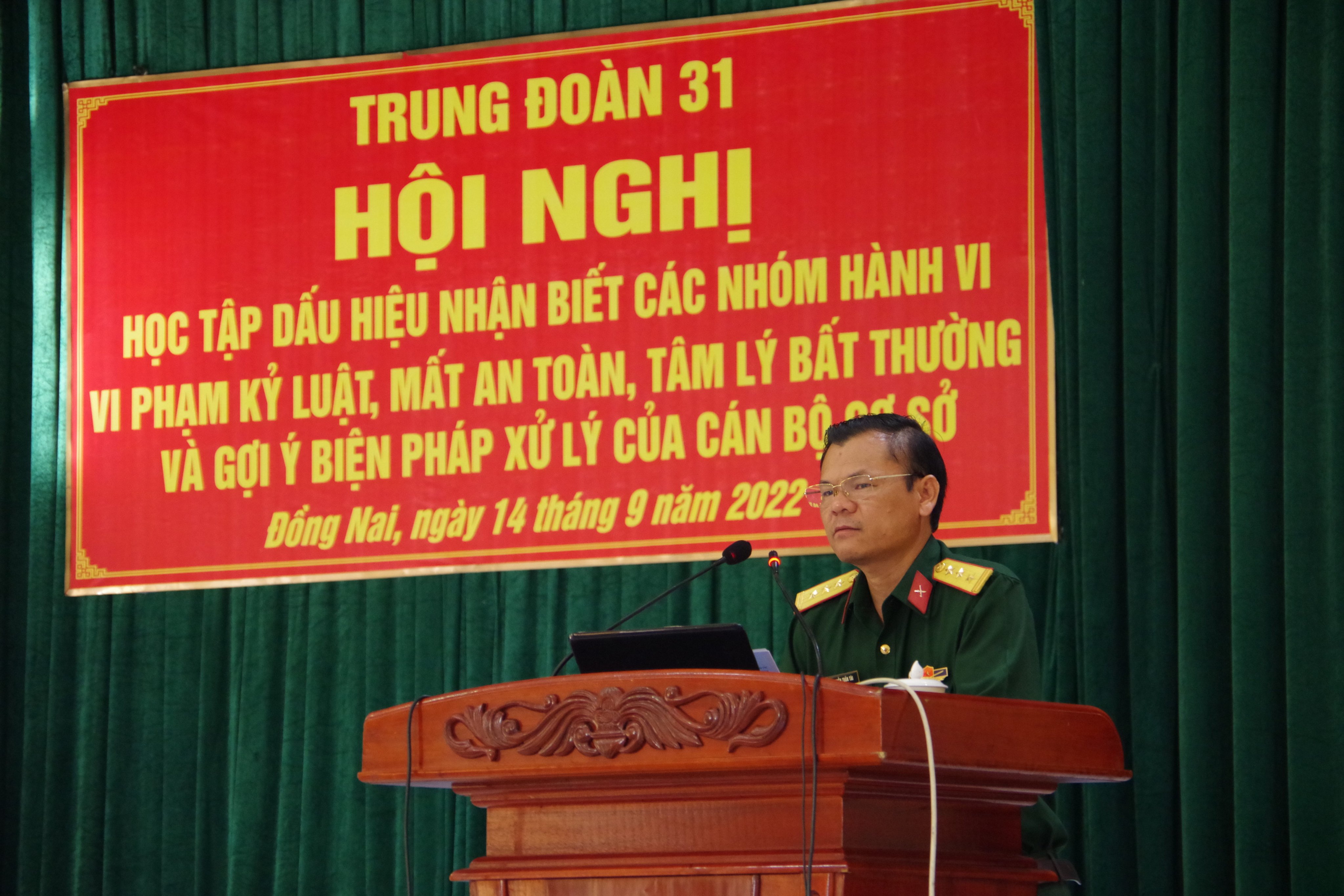 Tại hội nghị, sĩ quan, QNCN toàn Trung đoàn được nghiên cứu, nhận biết dấu hiệu các nhóm hành vi như: Dấu hiệu có ý định tự tử, tự sát; bị bệnh trầm cảm; dựa dẫm vào mối quan hệ của người thân, thiếu rèn luyện, phấn dấu; mất đoàn kết giữa chiến sĩ cũ và chiến sĩ mới; mất đoàn kết trong cấp ủy, chỉ huy cơ quan, đơn vị; vắng mặt trái phép. Dấu hiệu vi phạm về tình yêu hôn nhân, gia đình. Dấu hiệu vi phạm sử sụng trái phép chất ma túy, chất kích thích; nghiện ma túy; nghiện chơi game và các trang mạng xã hội; uống rượu bia say, bê tha sai quy định; cờ bạc, nợ nần, trộm cướp. Dấu hiệu vi phạm nguyên tắc tập trung dân chủ, quy chế lãnh đạo, quy chế làm việc; sử dụng tài chính, đất Quốc phòng, tài sản công sai duy định.