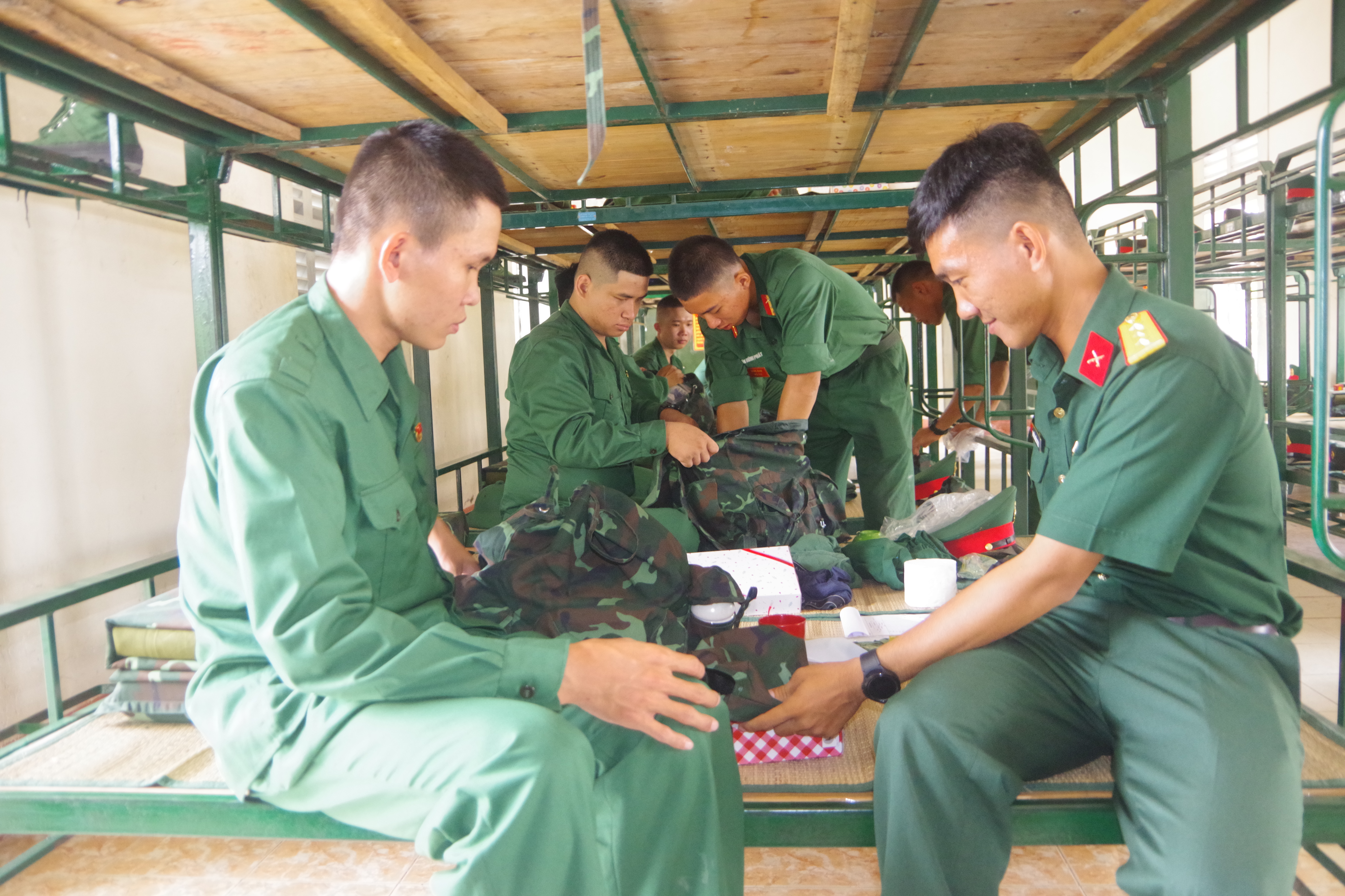 Cán bộ trung đội trưởng hướng dẫn chiến sĩ mới sắp đặt quân trang cá nhân