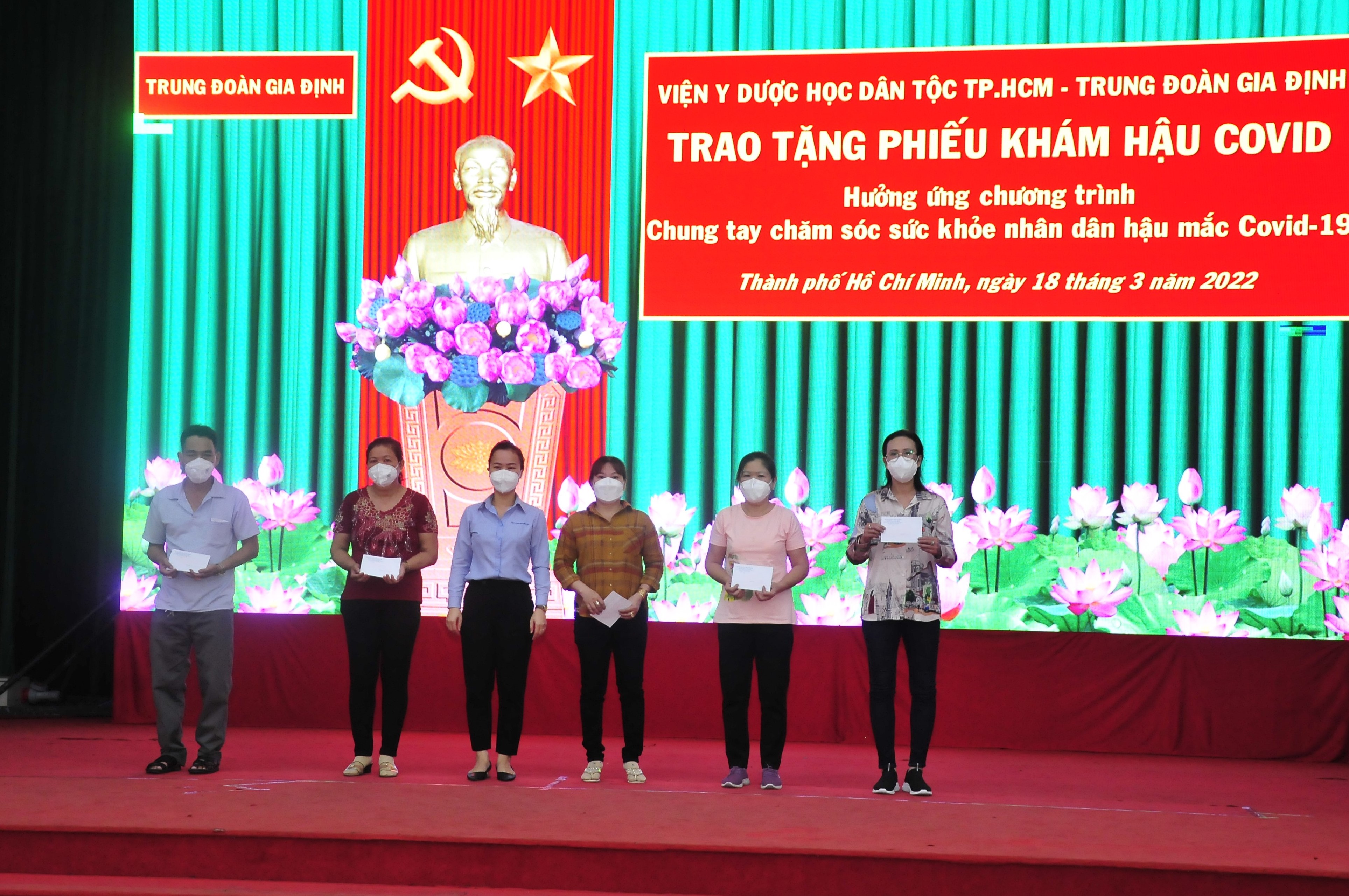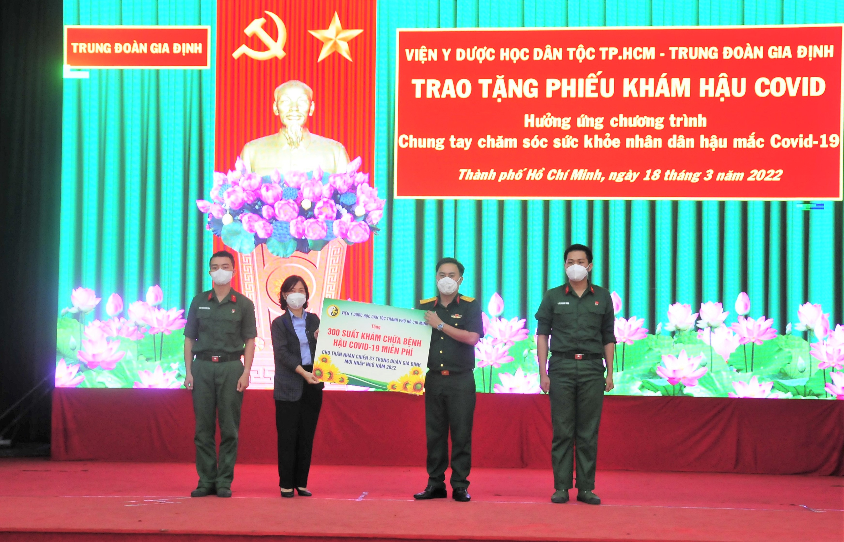 Với chủ đề “Sức khỏe thân nhân chiến sĩ mới – Nụ cười thầy thuốc”, 300 phiếu khám sức khỏe hậu Covid-19 được trao tận tay thân nhân chiến sĩ mới nhập ngũ năm 2022 tại Trung đoàn Gia Định. Mỗi phiếu khám sức khỏe trị giá 1.120.000đồng, bao gồm các nội dung: khám bệnh thực thể; khám và tầm soát tâm lý; đo điện tim và tặng miễn phí các sản phẩm nâng cao sức khỏe hậu Covid-19. Đây là hoạt động hưởng ứng chương trình chung tay chăm sóc sức khỏe Nhân dân mắc Covid-19,