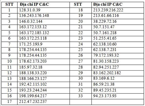 Cụ thể, các cơ quan, đơn vị cần theo dõi, ngăn chặn kết nối đến các máy chủ máy chủ điều khiển mã độc WannaCry và cập nhật vào các hệ thống bảo vệ như: IDS/IPS, Firewall … những thông tin nhận dạng về loại mã độc tống tiền mới này, bao gồm 33 địa chỉ IP các máy chủ điều khiển mã độc (C&C Server); 10 tệp tin và 22 mã băm (Hash SHA-256).