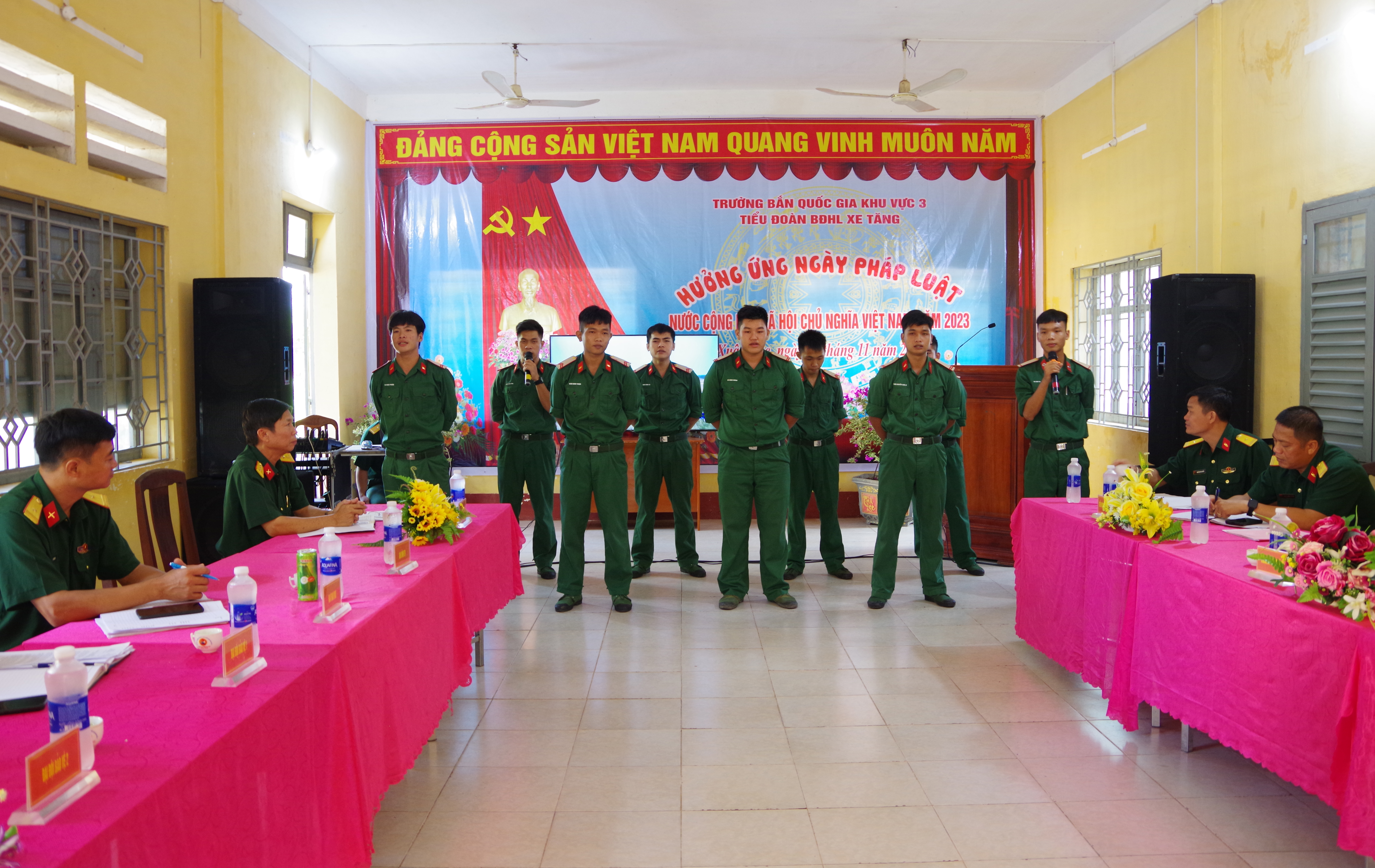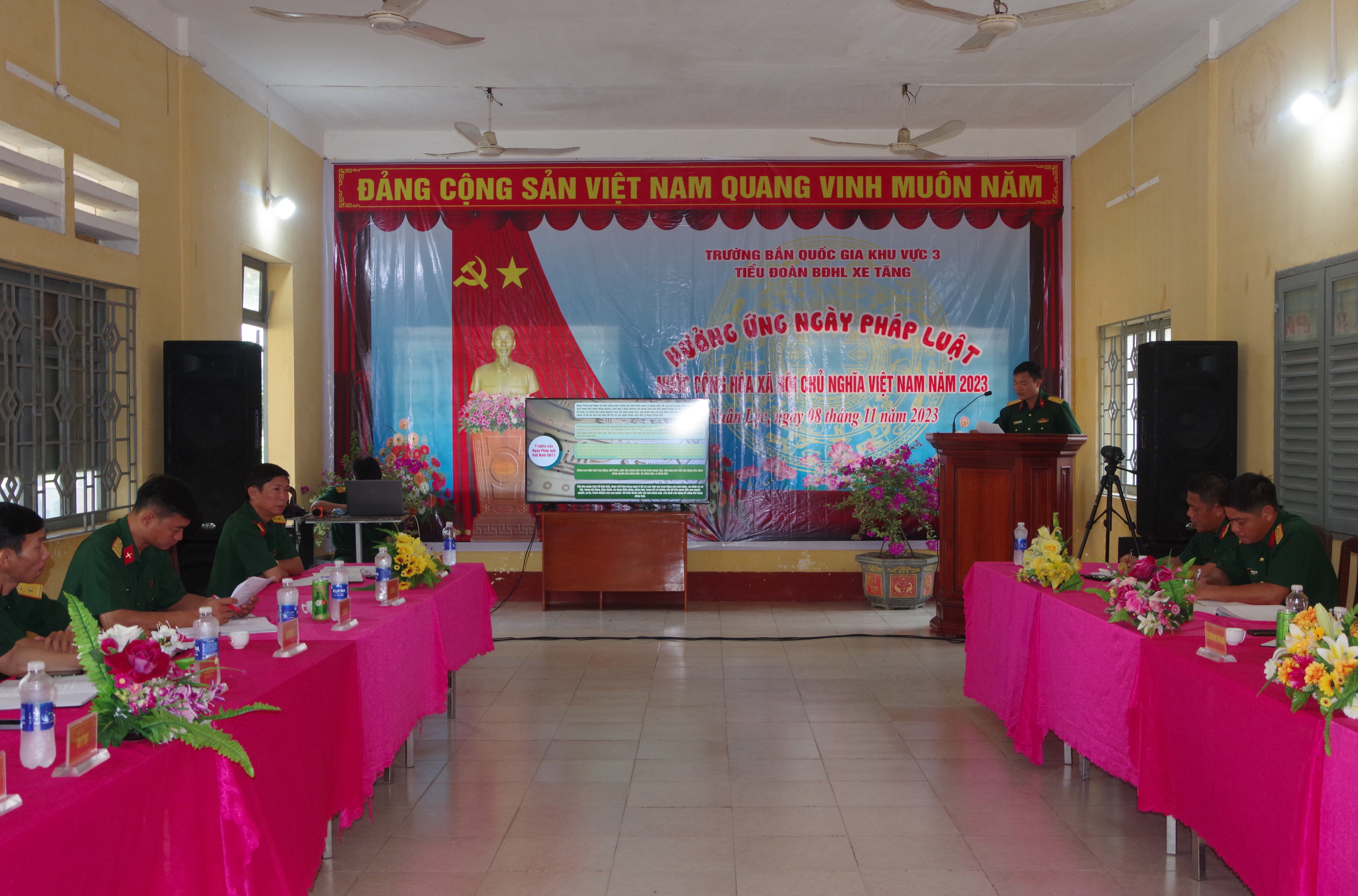 Tại buổi sinh hoạt, cán bộ chiến sĩ Tiểu đoàn nghe Thiếu tá Nguyễn Văn Quyết, Chính trị viên Tiểu đoàn tuyên truyền một số nội dung về Ngày Pháp luật nước cộng hòa xã hội chủ nghĩa Việt Nam; thông tin về tình hình chấp hành pháp luật, kỷ luật của đơn vị và địa bàn thời gian qua. Xen kẽ là video tuyên truyền pháp luật, kỷ luật, giải đáp, đối thoại kiến thức pháp luật, văn hóa văn nghệ… góp phần tạo không khí sinh hoạt sôi nổi cho cán bộ, chiến sĩ.