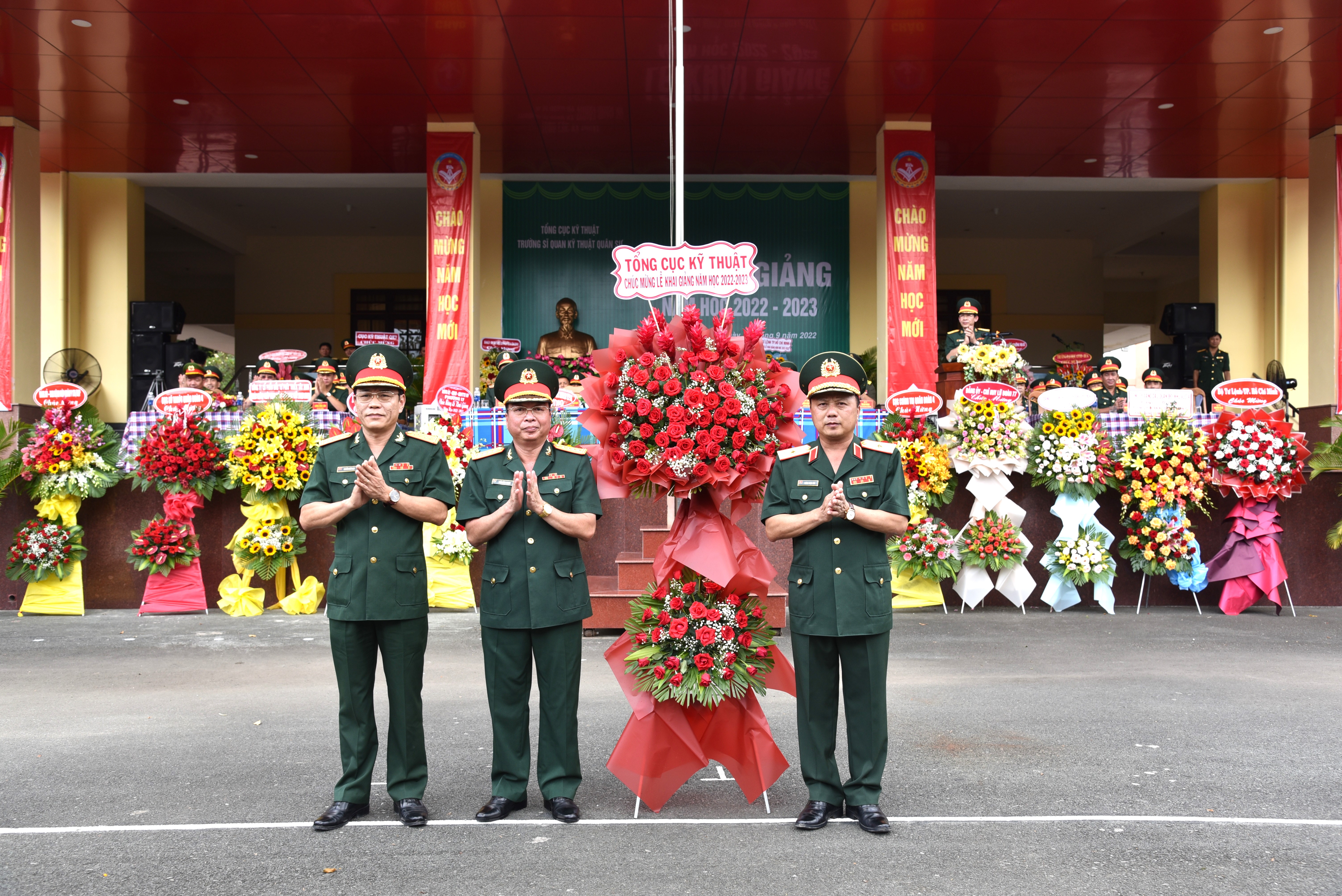 Thiếu tướng Phùng Ngọc Sơn tặng hoa chúc mừng Ban Giám hiệu Trường Sĩ quan Kỹ thuật Quân sự.