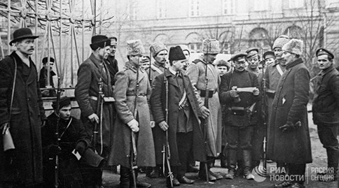 Đội tuần tra thủy thủ của Hạm đội Baltic được trang bị súng carbine Mosin đang kiểm tra tài liệu trên đường phố Petrogad năm 1917