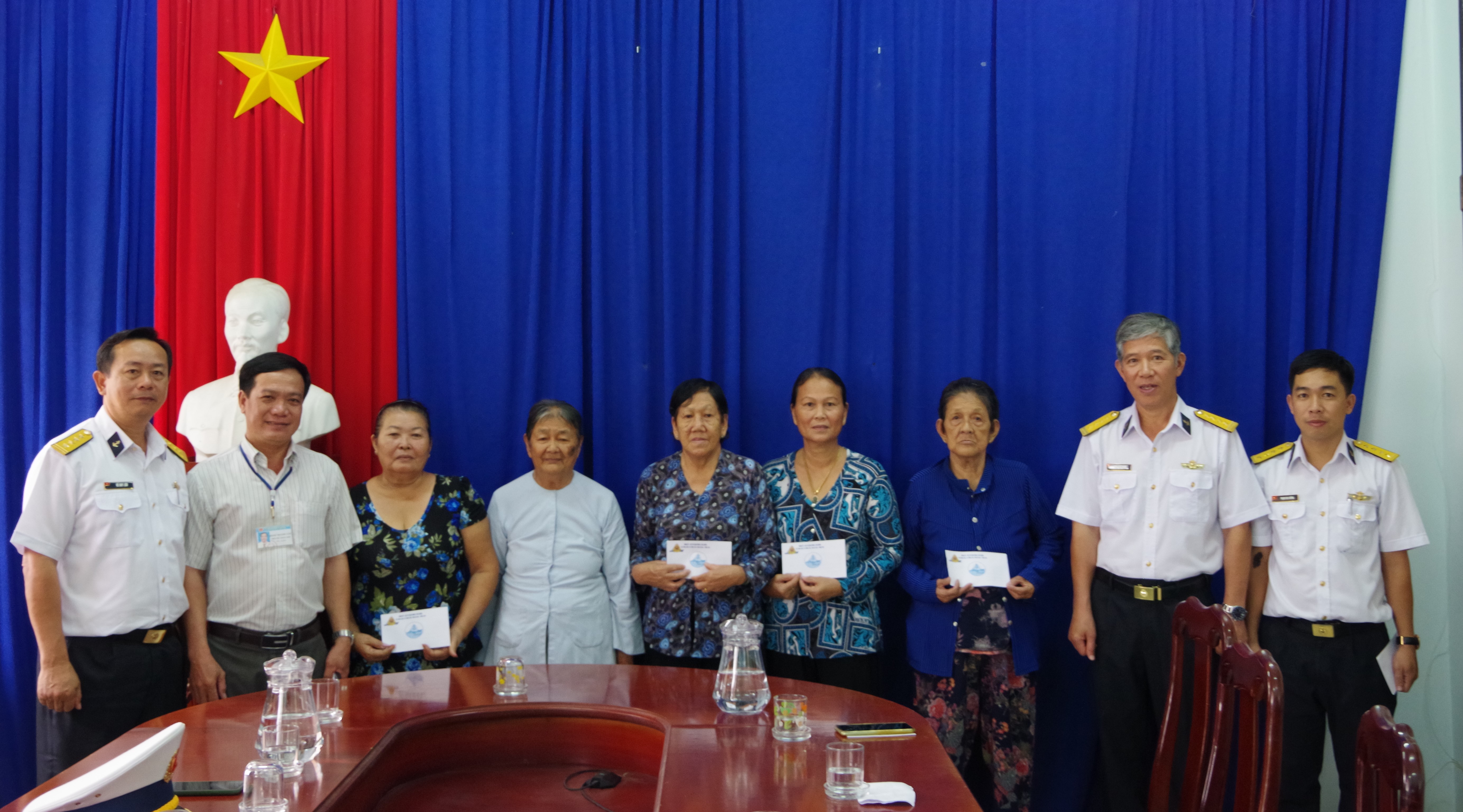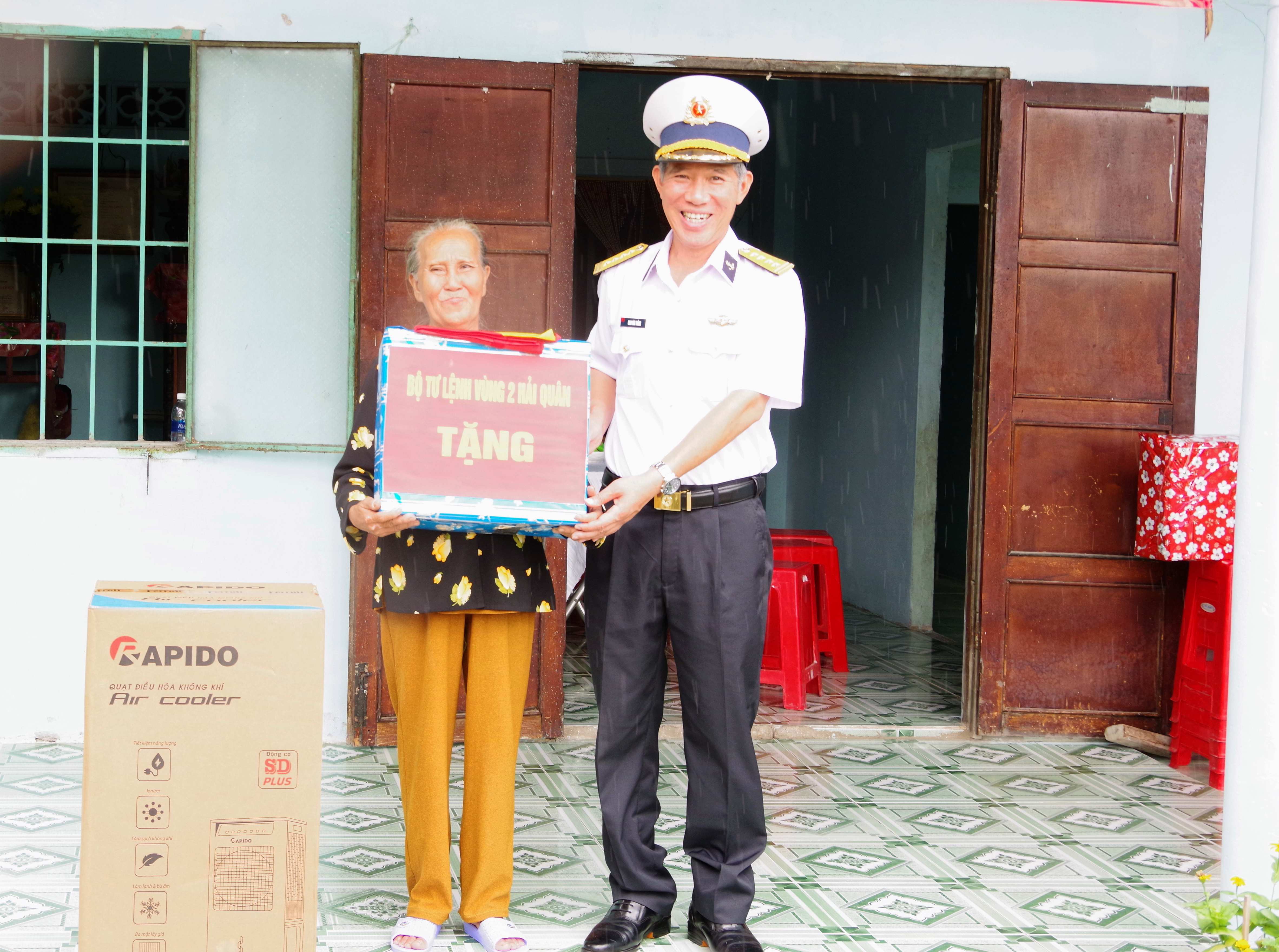 Đại tá Đinh Văn Thắng, Phó Tư lệnh Vùng 2 Hải quân trao quà cho gia đình Bà Nguyễn Thị Chua.