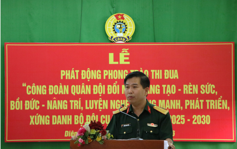 (QK7 Online) - Sáng 10/4, tại Thành phố Hồ Chí Minh, Xí nghiệp May, Cục Hậu cần - Kỹ thuật Quân khu tổ chức Lễ phát động phong trào thi đua “Công đoàn Quân đội đổi mới, sáng tạo - Rèn sức, bồi đức - Nâng trí, luyện nghề - Vững mạnh, phát triển, xứng danh Bộ đội cụ Hồ” giai đoạn 2025 - 2030. Đại tá Phạm Thanh Nhân, Chủ nhiệm Chính trị Cục Hậu cần - Kỹ thuật Quân khu dự và chỉ đạo buổi lễ.